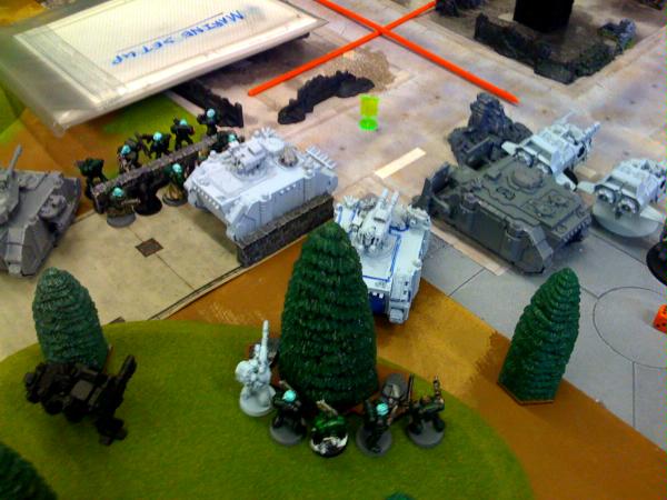 And my defensive plan was turned on it's head. I had prepared for going second, with all off my hard hitting units set up as far away and as hidden as possible, but most of his army was in the open, so I chose to go first. I figured the chance of destroying some of this transports in his deployment zone was too good to pass up.