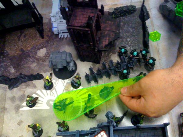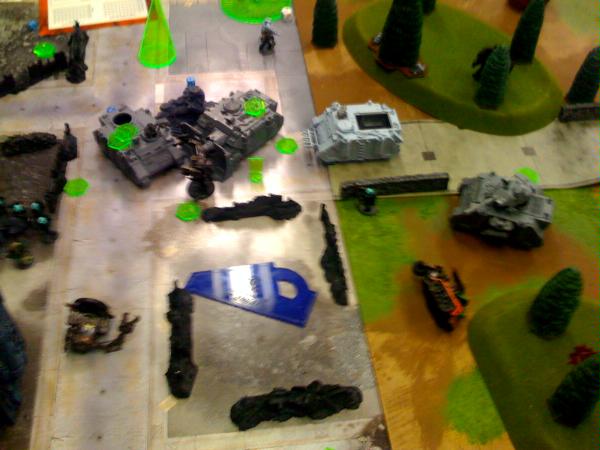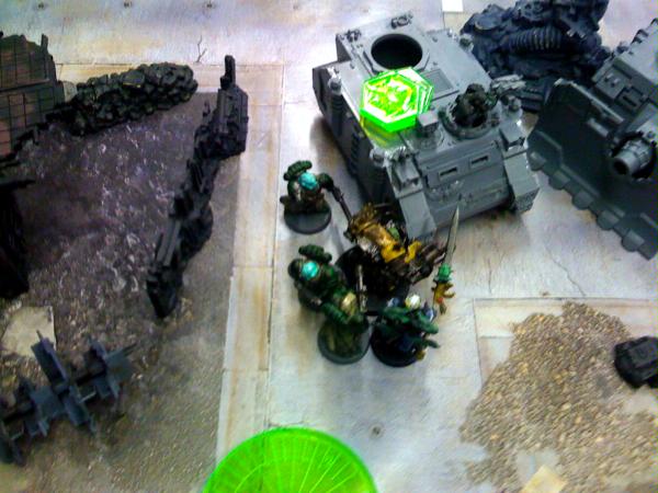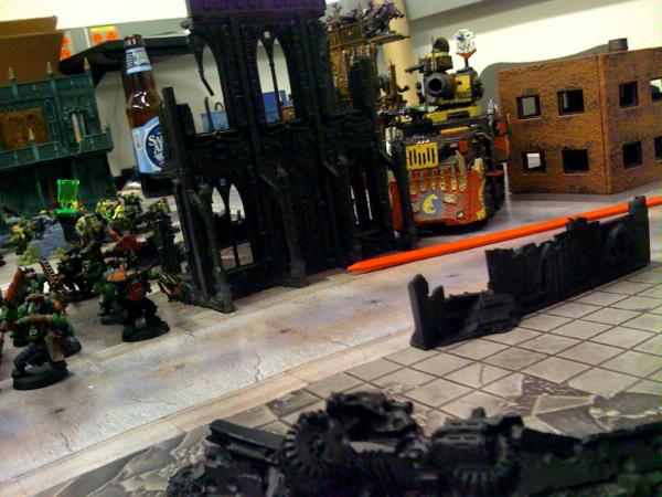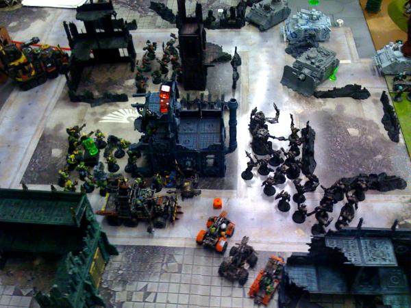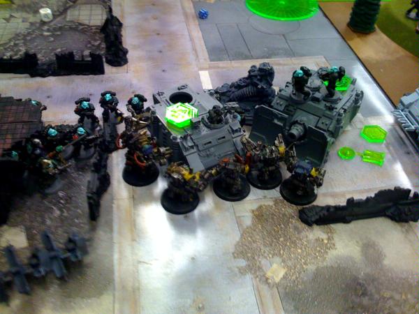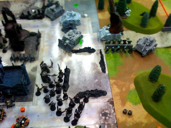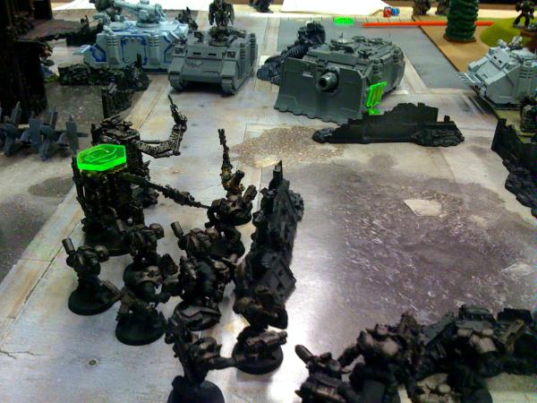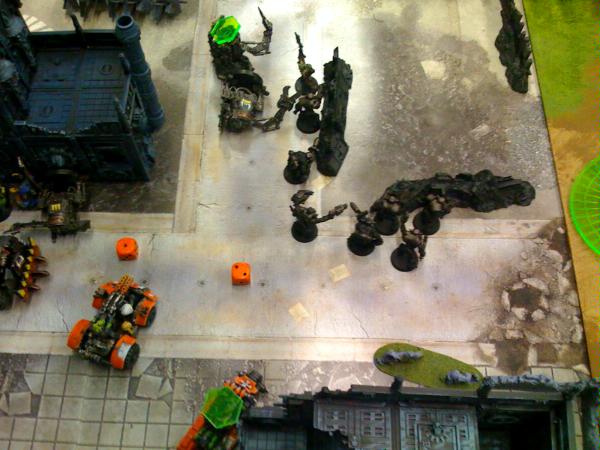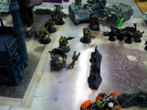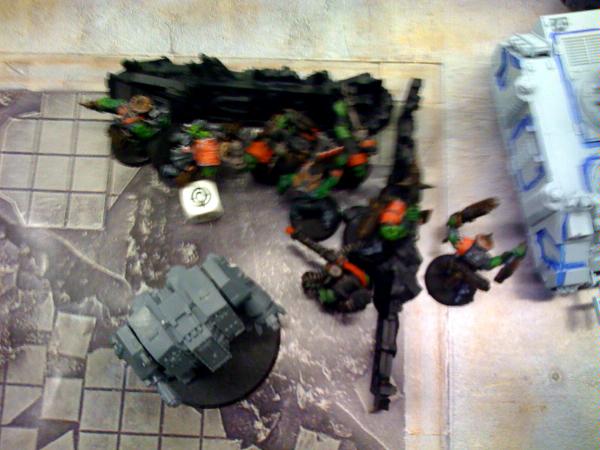 And my Killa Kans managed to destroy his Heavy Bolter Razor back, letting his Melta gun combat squad deep in his enemy lines. I maneuvered my forces up. I also shook his venerable Dreadnought, Agmabob the Burninator.