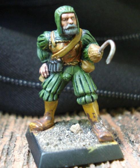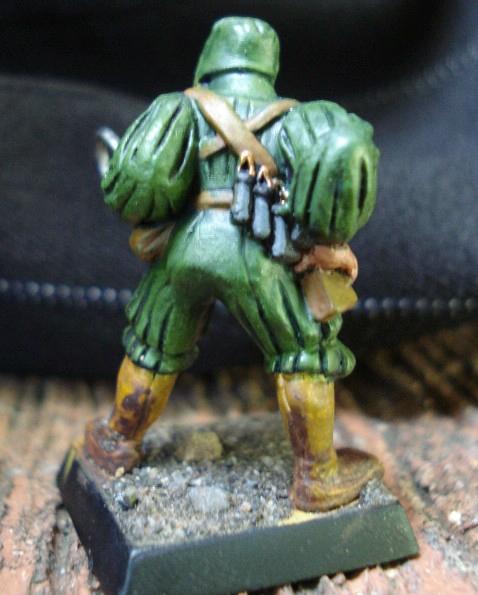 My next victim is pretty much the opposite, quite a character - an Empire Handgunner from the 6th ed. starter box. The hook is another bit of bent paperclip, and eventually I think I'd like to fashion him an eyepatch, and a ball-and-chain on his front leg.