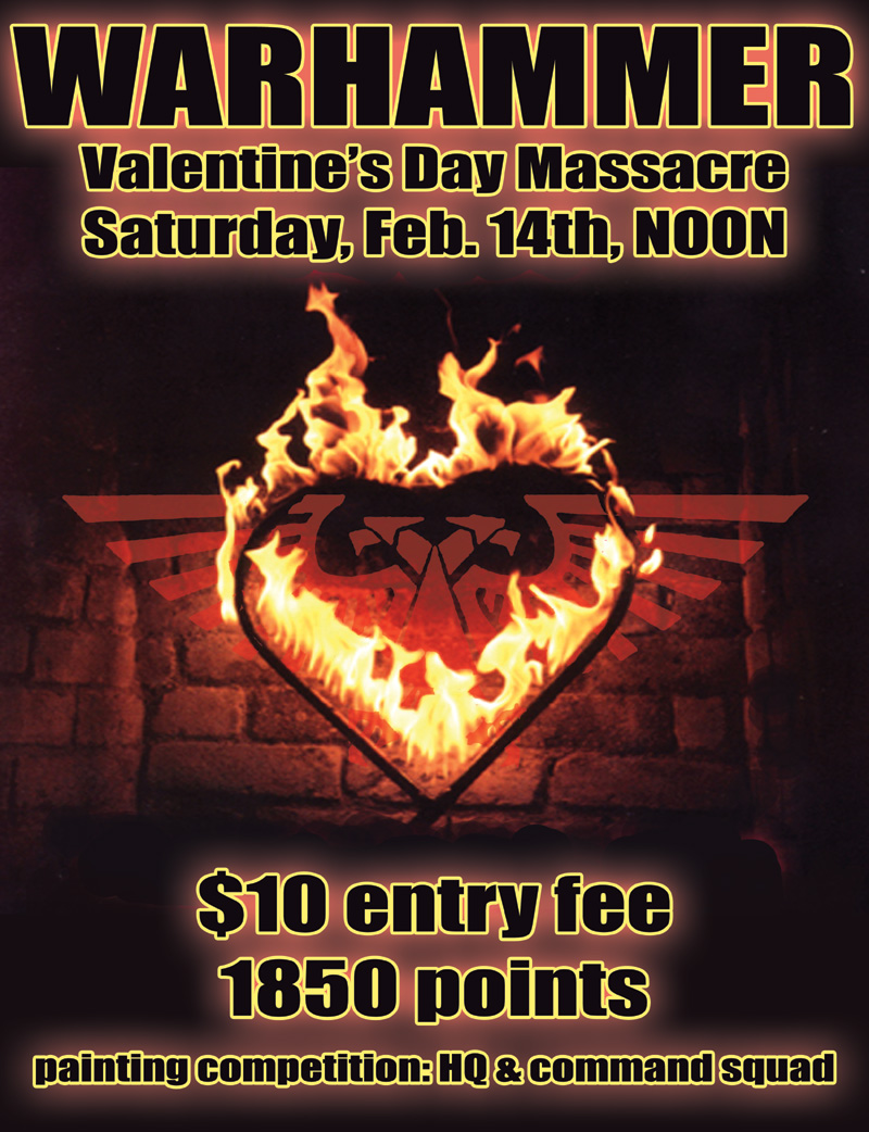 Be here at Noon for an 1850-point 40K battle -- entrance fee is $10, which goes toward prizes! First prize for the tournament is a Battleforce of your choice, or merchandise of equal value! Also, enter our painting competition (free with entry) for more prizes -- HQ plus command squad required! Four rounds of Swiss Draw, 11 players (5 pairs plus a bye) max entry. Call ahead for details!