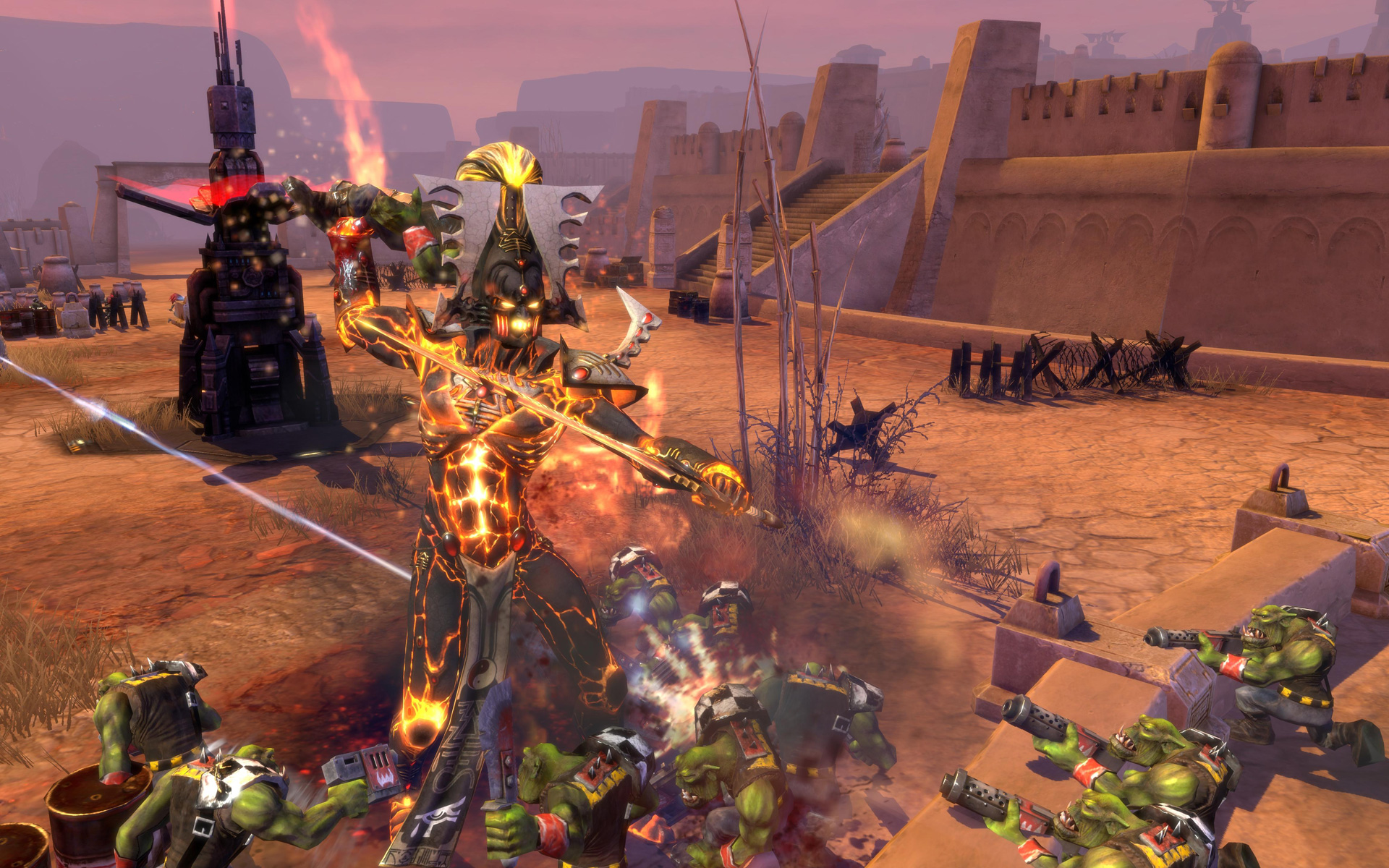 Fiery incarnation of the God of War and Murder. Massively powerful melee unit. Enhances nearby troops, making them resistant to ranged damage and immune to suppression.