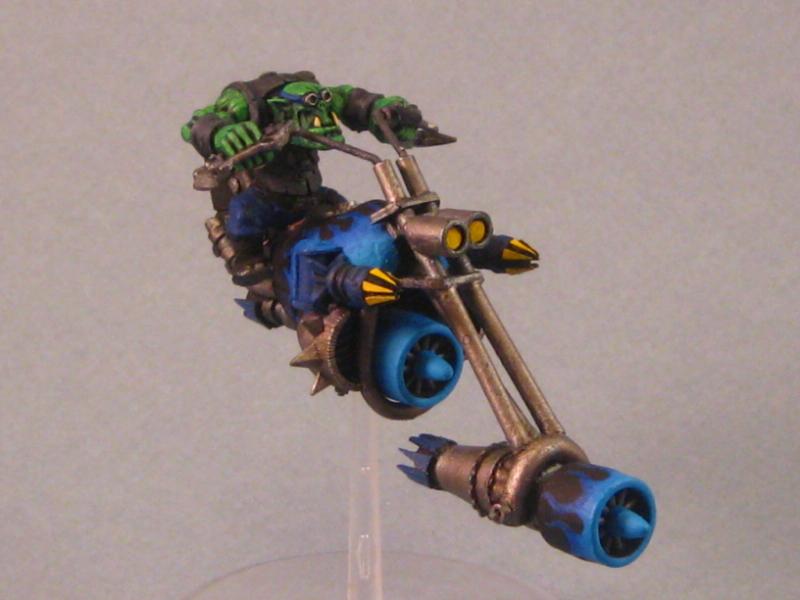 First, everybody has their own style. I do a lot of hot-rodder or "crab claw" flames, but it's all personal preference. For the flames on the Deff Choppa above, I started with my darkest shade and roughed out the basic shape. I then worked in, using lighter blues until I reached the base of the flame. (Base of the flame is hottest, and burns the brightest!) After all is said and done, I went in with black and cleaned up the edges, making the flames sharper.