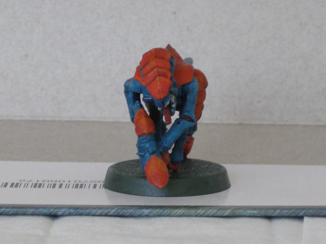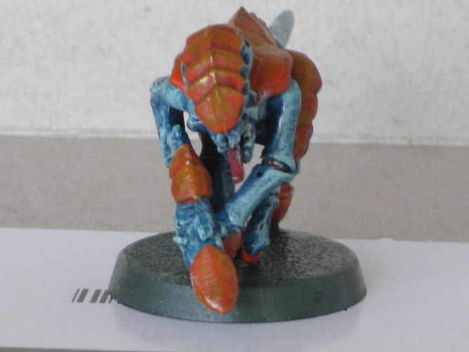 I based the Gaunt in black, then painted over the carapace, claws, etc with orange. I then painted everything else dark blue. I followed up with another coat of orange, along with turquoise over most of the blue (leaving just the rib-area un-touched). This was breaking from `safe' in terms of colour selection. I next tried washes for the first time. I washed the carapace with red, and the body with blue. Easier than I expected, but the effect was different to what I had anticipated. I then proceeded to drybrush the carapace with a yellow/orange and the body with a paler turquoise. I decided to blend these by washing the whole model again, which seemed a good idea. Finally, using the fine detail brush for only the second time, I tried to add red to places. I slipped a couple of times, but I think I am almost used to using it.