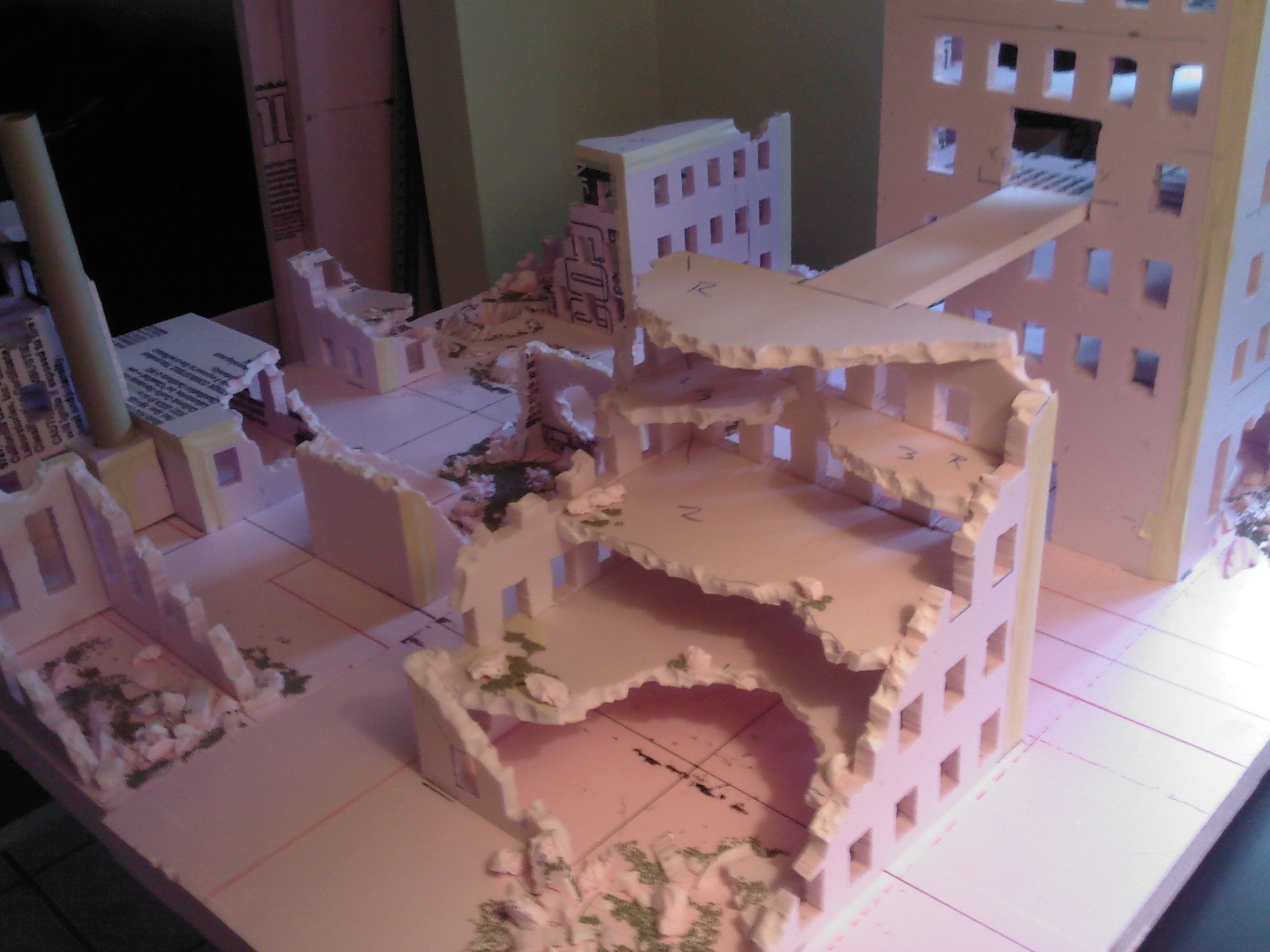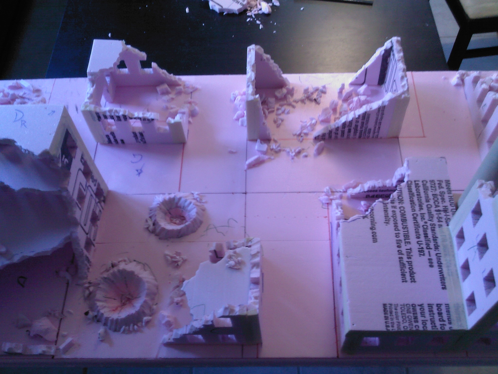 If you plan on building LOTS of ruins, head out to the local Home Depot/Lowes & pick up a sheet of pink or blue insulation. They sell it in 4'x6' sheets in thicknesses from 1/2" to 2" (I'd reccomend 1/2" for ruins). Pick up a utility knife and a drywall-T (basically a big metal ruler with a perpindicular ruler attached to the top- makes cutting straight lines super easy) and you're ready to go (when I bought mine, I used the T & knife to cut it into 4'x2' sections to fit in the car). To build the ruins, measure out sections as big as you want to go, then cut them out- pretty simple and as long as you keep one straight edge on each piece, you can match up 2 pieces to make a corner. If you want floors, match them up into this corner. Glue them together with elmer's glue and stick toothpicks in to reinforce the joint and you're done. If you want to make windows, measure out, draw, & cut out windows onto a piece of thick card (I use a comic book board) and use this as a template to draw & cut windows on the buildings. You can even use sections of the insulation as a base for the buildings. I've attached a few pics of my WIP city using these techniques below. At some point, I'll have to put up a full wriet up on it in the articles section.
