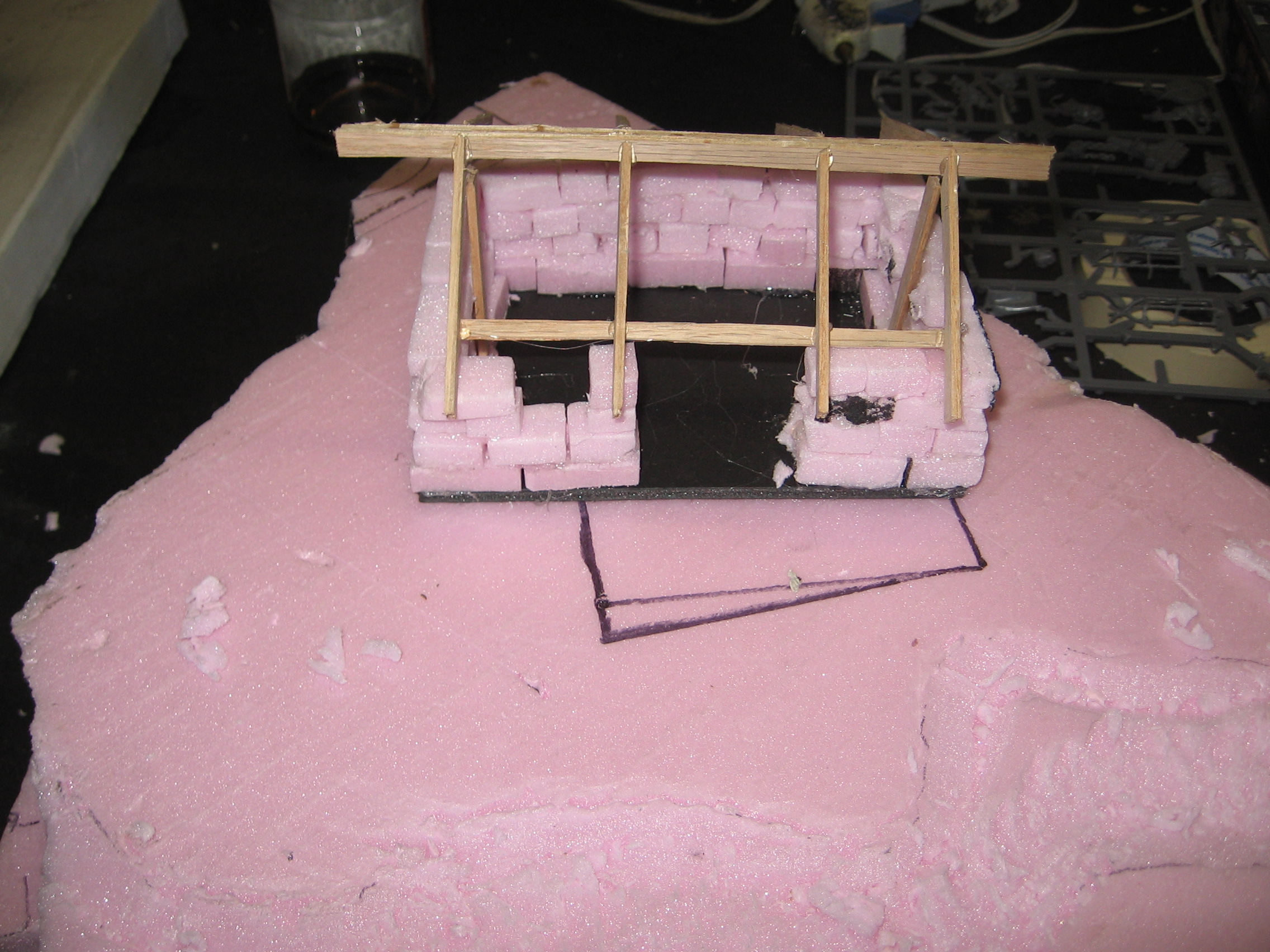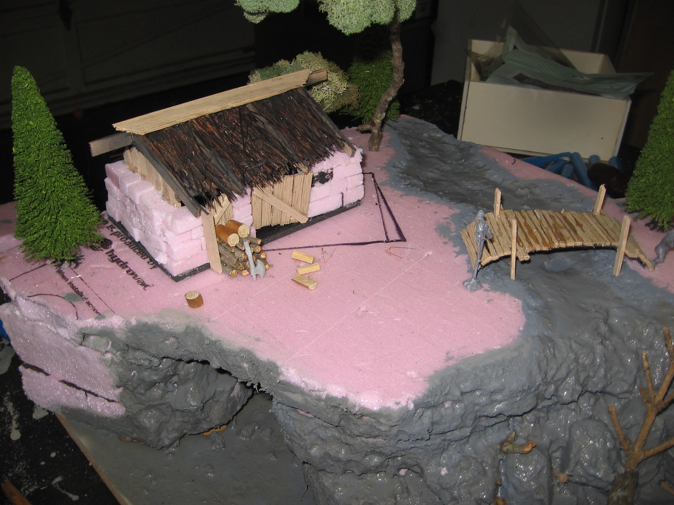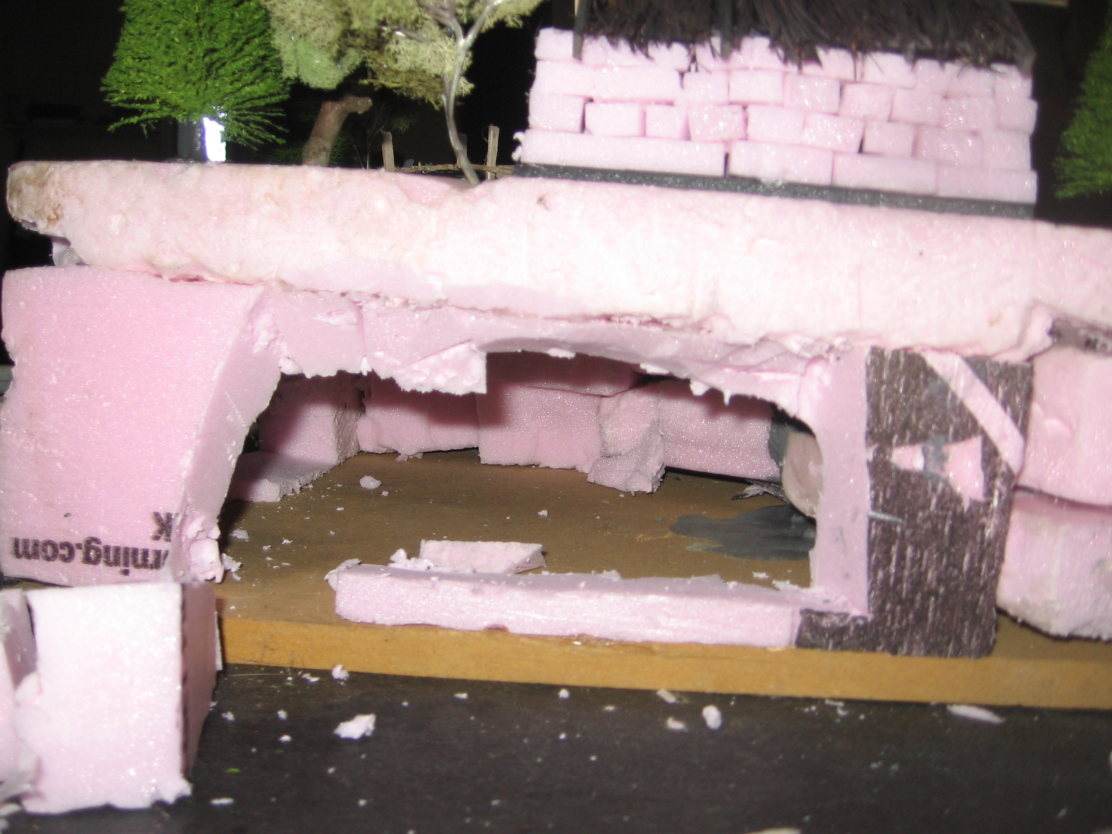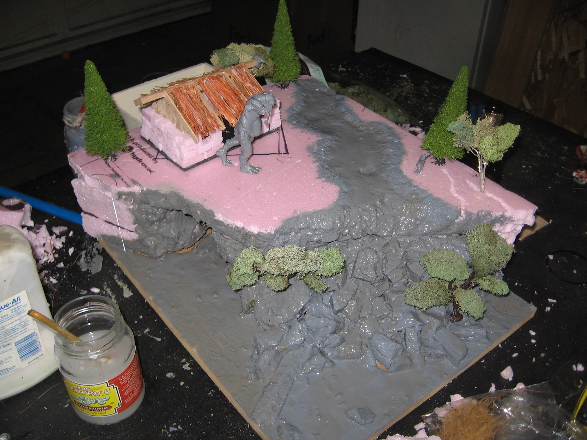 I wish I took more pics of the water effects. Dig out a shallow groove in to pink stuff, and stack a bunch of random chunks of pink for the water fall. Paint it a couple of times, mix up some plaster or tile grout with paint and water. While wet throw some real sticks and rocks in and around. I started with some dark blues and greens. Once that was dry I added some real dirt, brown paint, and sand mix to all the sides of the creek. Stipple some grays and catachen green here and there. Now take some blue and green ink in nice patches. While thats wet take white and kind of drag it over the areas, this makes it all happen. Apply the water effects, making sure it's only 1/8" thick per coat. Do this 3 times. Finally, take some more white and drag it again. Don't overdo it though.