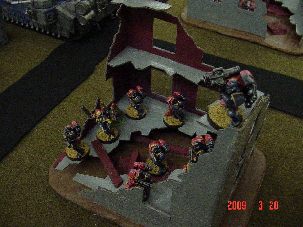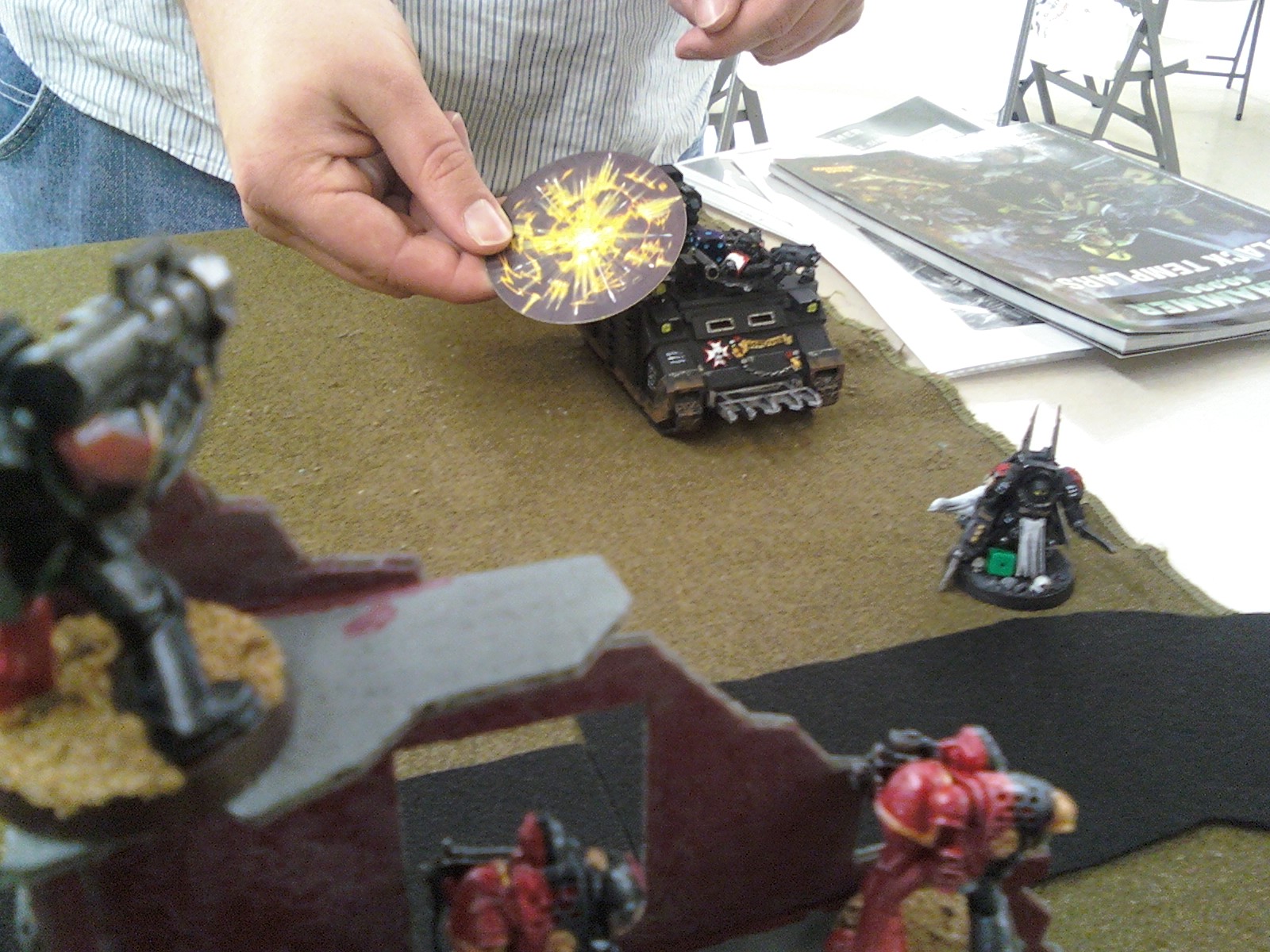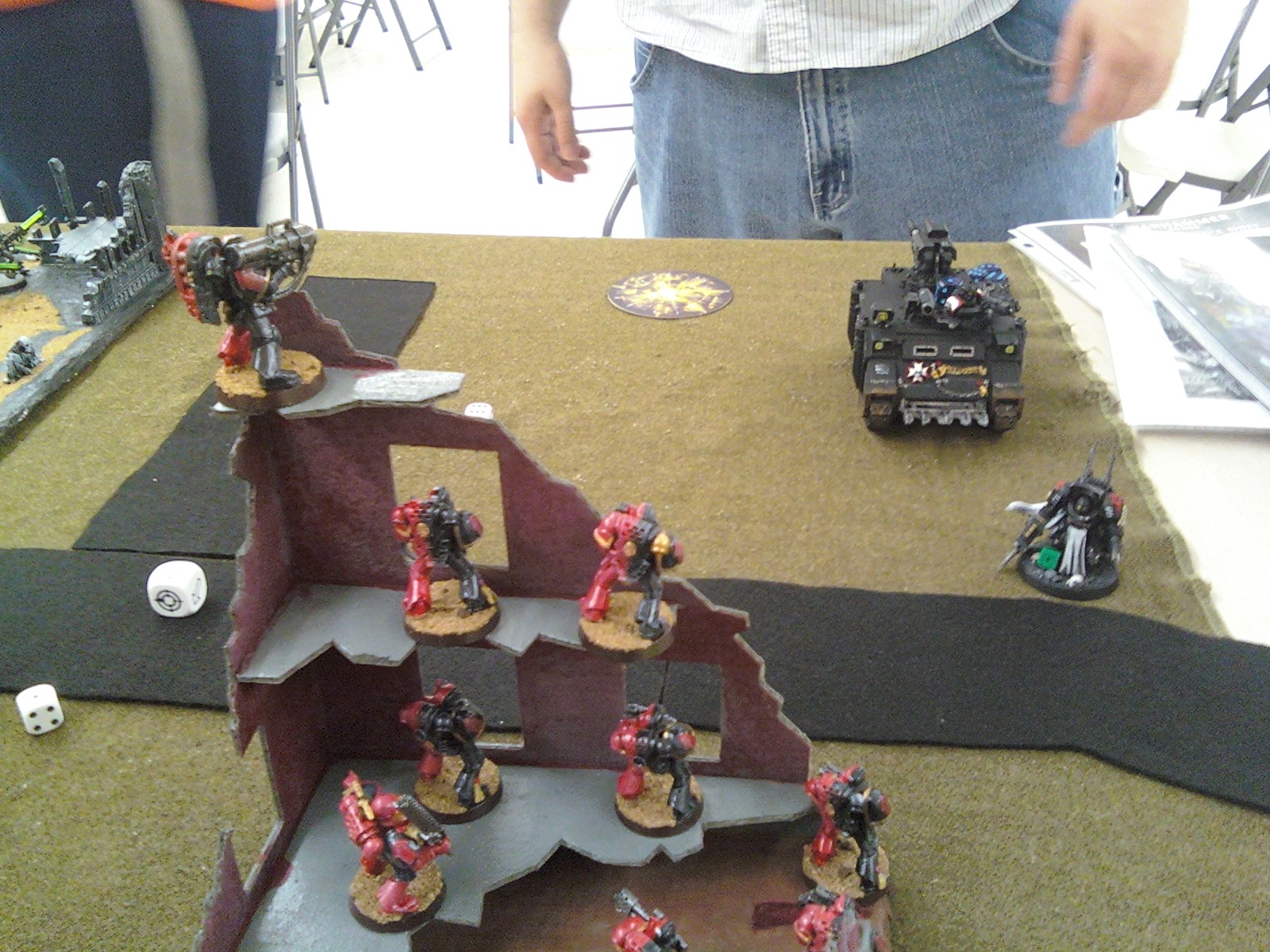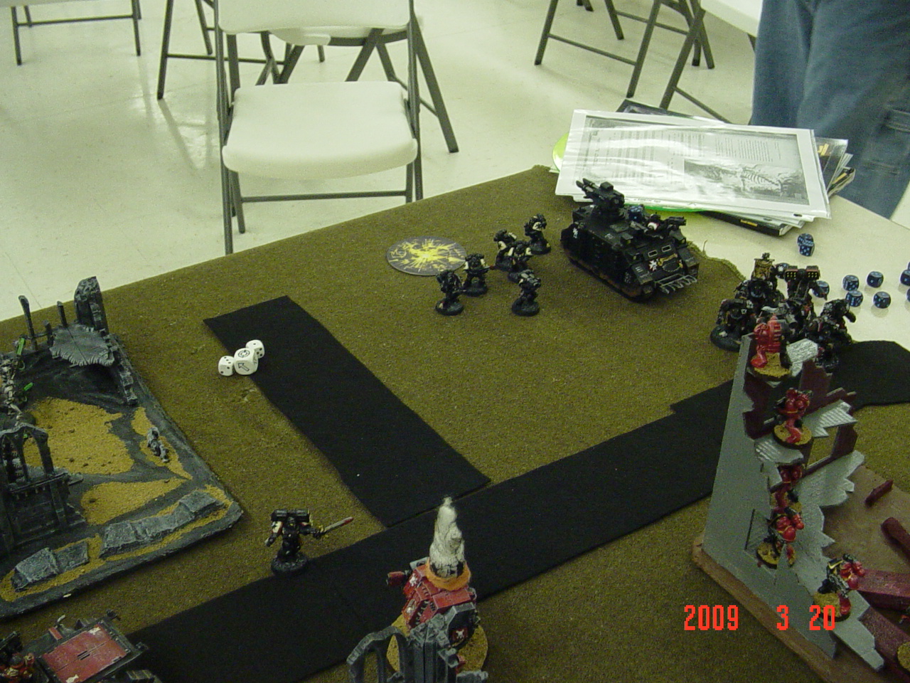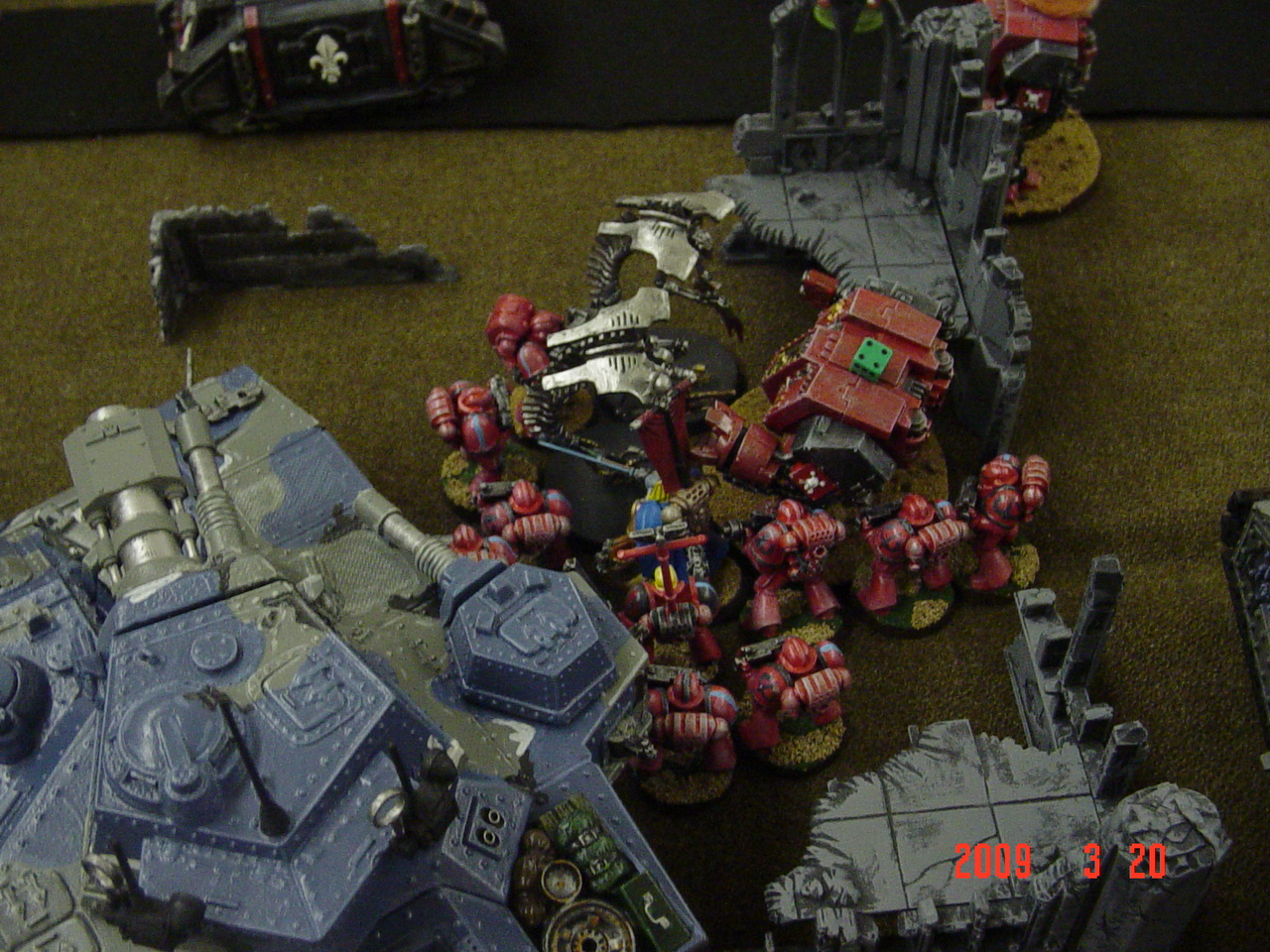 A lone assault marine battles the remaining battle sisters, after surviving tank shock. The dead priests Vortex grenade can be seen in the back ground wreaking havoc.