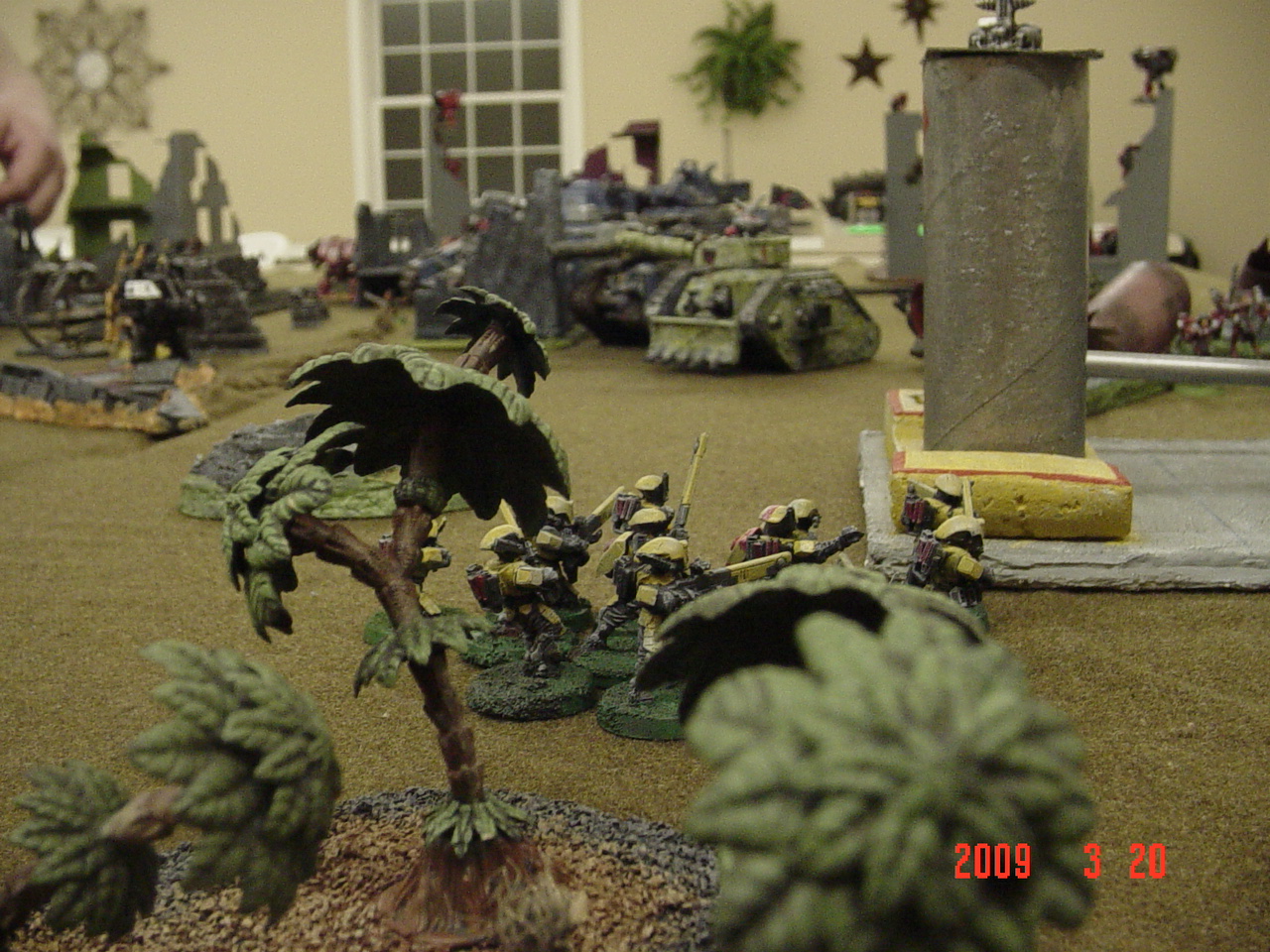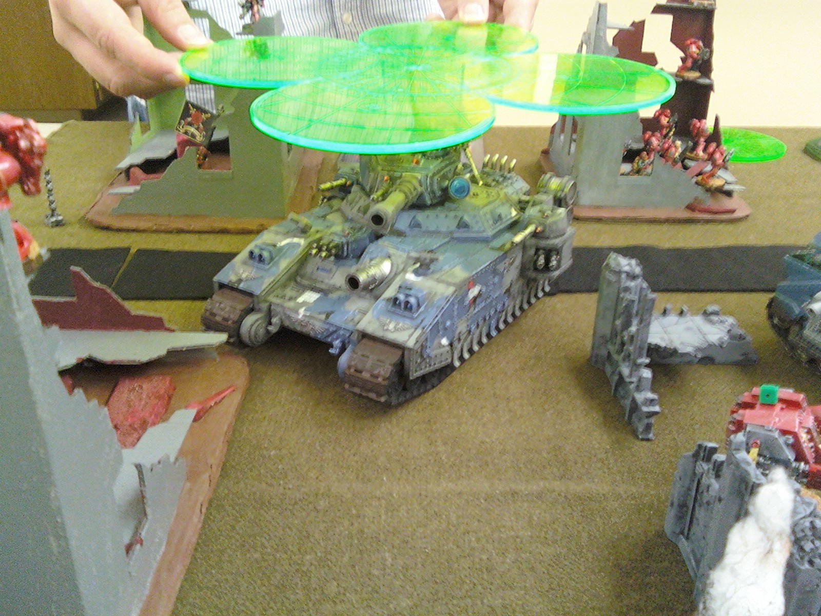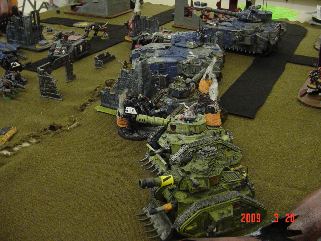 The Leman Russ Tank Squadron advances with Battle Cannons blazing. Also, the Hellhammer drives onto an objective in some ruins.