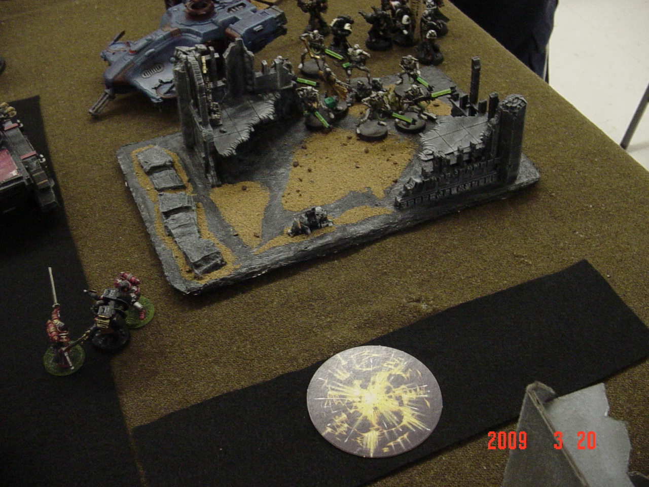 One highlight from the battle was a fanatical priest who employed a Vortex Grenade. One the first throw, he wiped out half of his own squad. The vortex/warp rift also eliminated a ruined building, a razorback, and scared the Necrons out of their cover in a ruined building nearby.
