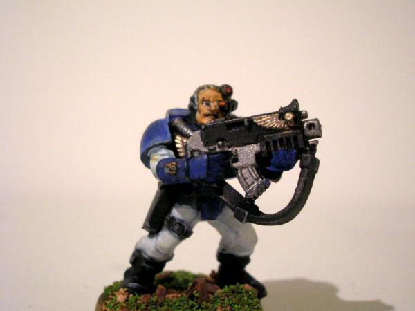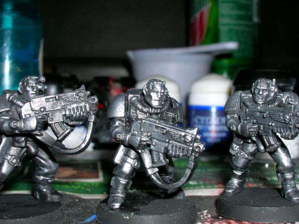The first thing I do with my minis is clean them, file off the mold lines, and then prime them with black primer. I was thinking about doing white for the scouts but decided against it and went with the black. Once that is done I dry brush the whole mini in boltgun metal. This brings out the details of the mini and let's you know where all the shading details should be. It's like a guide coat for your placement of paint and highlights. Here is an example that I photographed earlier tonight.