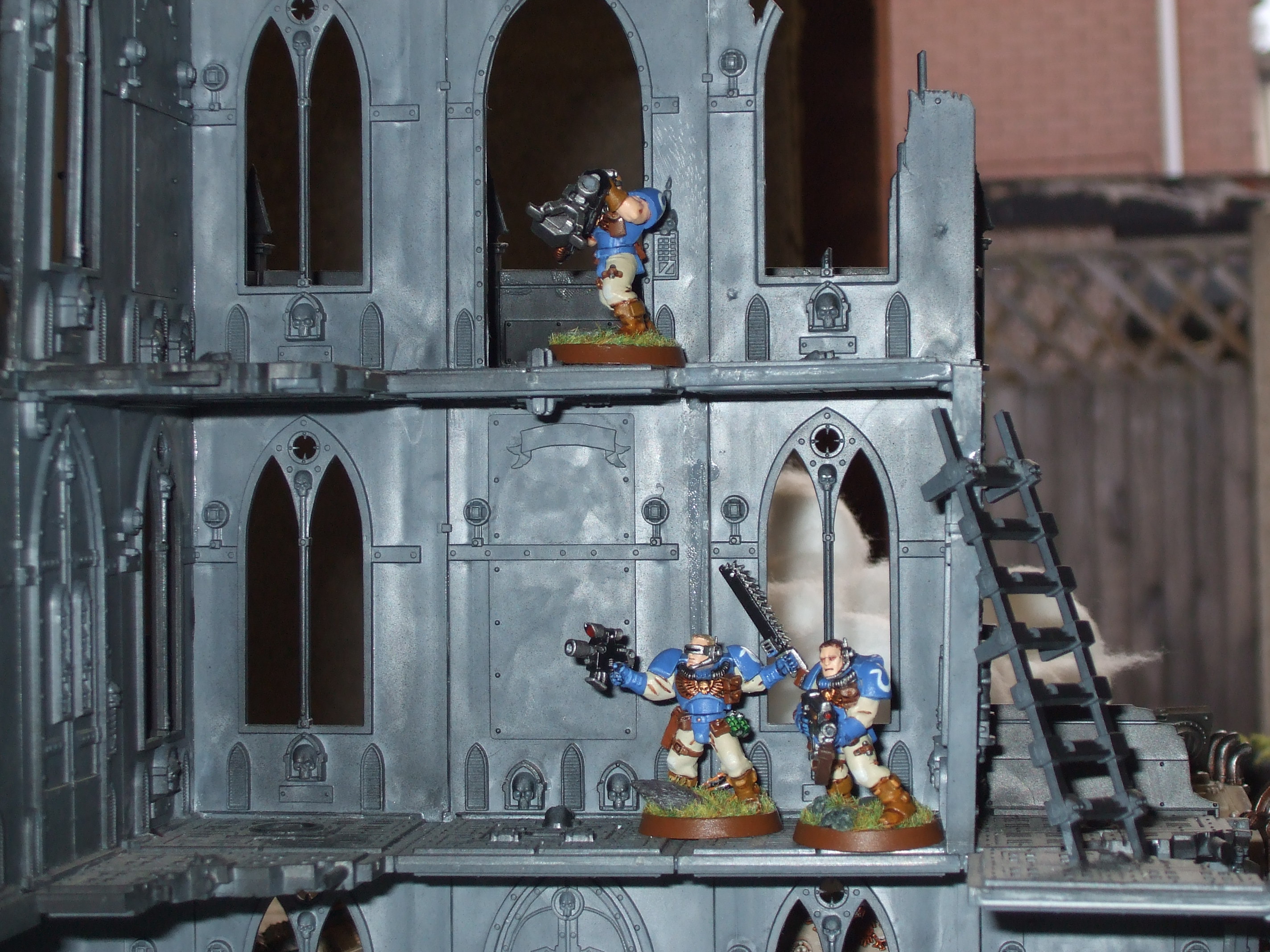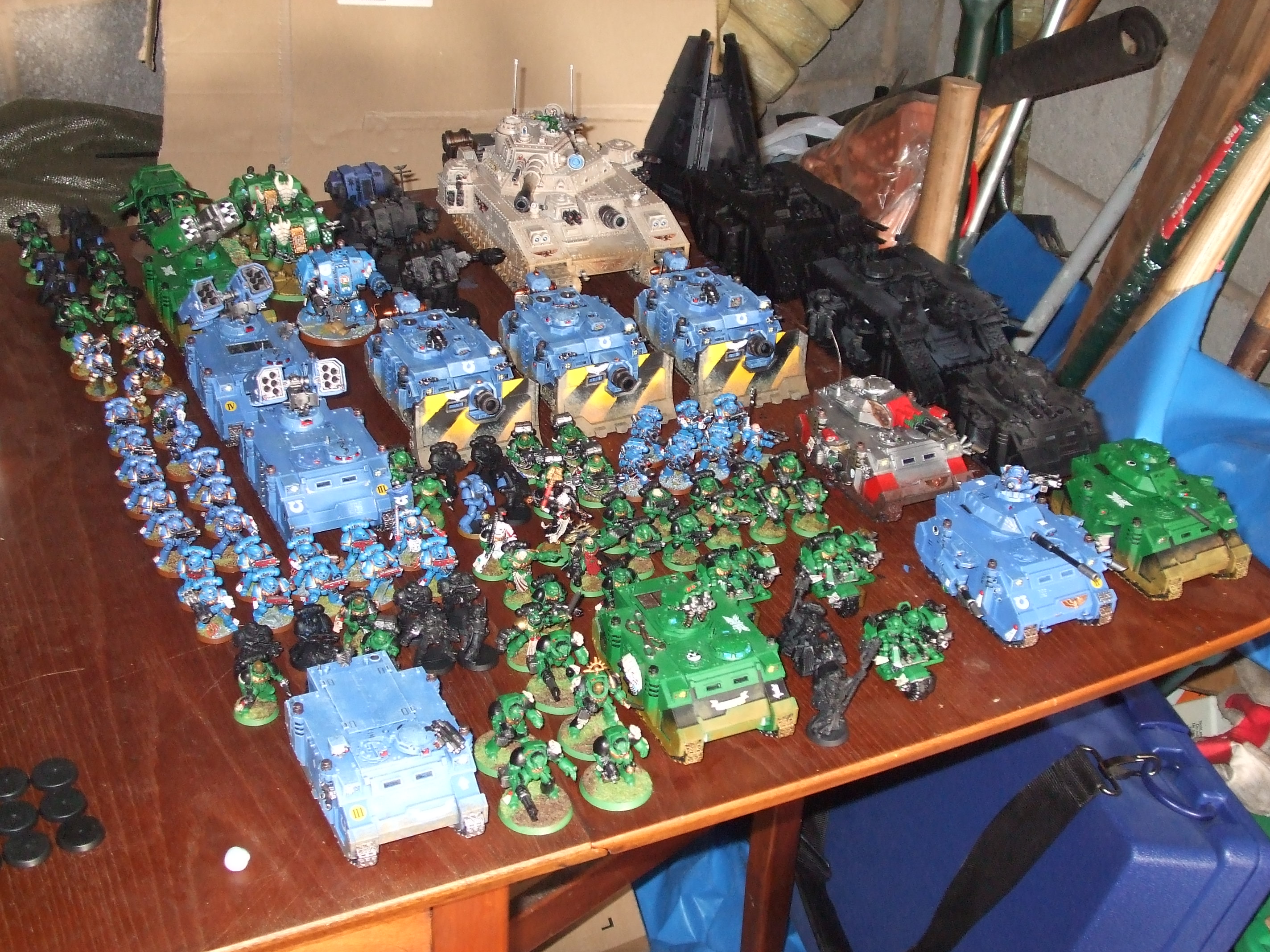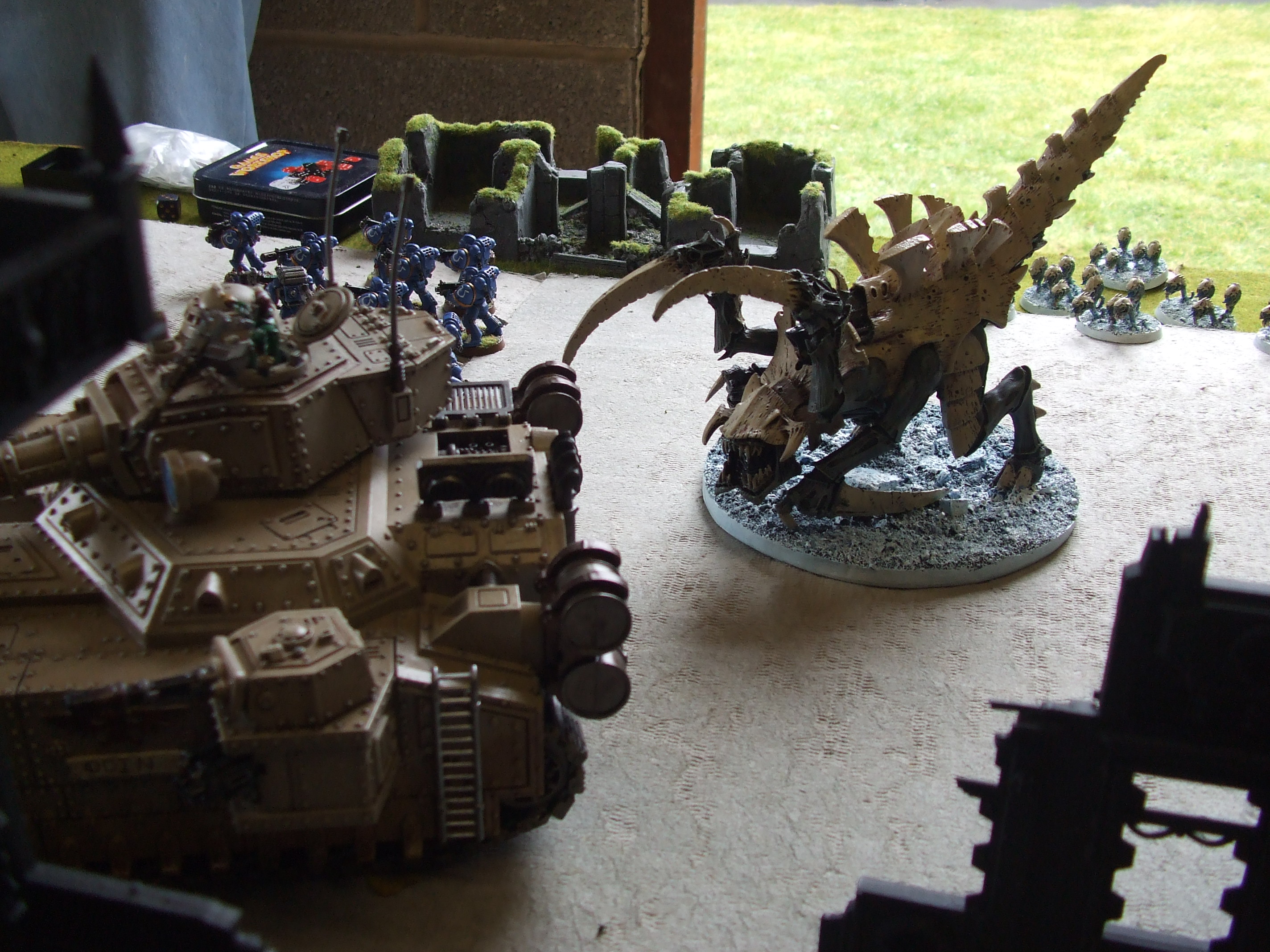 Ok, first off apologises that this is a regular thread and not an article in the battle reports format, but I'm not the best at internet stuff and I couldn't for the life of me work out how to do the uploading images 'things'. Kinda pathetic I know  , but it is past midnight as I write this (the only free time I get with a 6 month old son who's teething) so I don't have too long to fiddle about. So instead I've opted to cheat and post it as a regular thread. Recently I played a 6000 pt Apocalypse game with driverbob25 with a special scenario. I was using my Tyranids and driverbob25 was using Marines. The story behind the game was that the Imperium had detected that a dying Tyranid hive ship, the last surviving bio-ship from a splinter fleet designated Hive Fleet Nocturne, had crashed on a world called Thetis. Whilst it was still a threat they could not ignore the Imperium felt that a single, dying vessel offered an unparrelled opportunity to study the Tyranids. With a false sense of security the Imperium decided that before they destroy the Tyranids they would try to study them in what they belived to be as controlable a situation you could have with such lifeforms. A force of Ultramarines and Salamanders lead by Tigurius, the only psyker to ever have touched the hive mind on a psyhic level and therefore the best person to lead a study on such matters, arrived at Thetis with a contingent from the Magos Biologis in order to undertake field studies. Whilst the allied Space Marine fleet retained orbit in the shadow of the planets moon to avoid detection the Magos Biologis staff travelled to the surface to begin their work. The people of Thetis were kept in the dark that the Tyranids were even there, a deliberate deception by the Imperium who wanted to study the Tyranids in as natural a state as possible, which meant no reaction by the populace which would trigger the Tyranids into undue activity (such as chasing after fleeing prey). It is worth noting that Tigurius was against such matters, feeling that the best course of action was to evacuate as many as possible and then destroy every Tyranid organism on the planet. Over the course of several days the research team on the planet did indeed gain valuable data and samples from which the Imperium would be able to generate new means of combating the Tyranids, however (in typical sci-fi / horror movie style) the scientists badly miscalculated how long the window of safe operation was. Too engrossed in their studies on particular areas of the Tyranid biology they failed to notice the larger picture. With vast muscular contractions the hive ship spew forth thousands of tons of bio-matter into the atmosphere, a mix of spores, alien bacteria and mucas. On their scanners in the Magos Biologis research outpost it was as if a vast biological volcanoe had erupted. Unfortunately what goes up must come down and all too soon spore mines the size of Rhino APCs came crashing down over the planet for several hundred miles around the hive ship. It was at this point that communication to the planet was lost and Tigurius wasted no time in ordering the Space Marines into action. Upon arrival at the nearest landing site to the research post they found the area desolated by spore impacts, viscous fluids already begining to digest whatever life it came into contact with. It was only when finally on the ground that the Marines recieved short wave comm transmittion from a member of the research team. What was left of the team had taken refuge in the strongest building of the nearby town along with all the data they could salvage and a large group of civilians. But it was not just the bio-matter raining from the sky that had caused them to take hiding. In it's death throes the Hive ship birthed a vast horde of Tyranid creatures, from tiny rippers to massive carnifexes and larger, millions of organisms spewed forth and began to scour the planet in a vast wave of teeth and claws. It was imperative that the Imperium recover the data before it was lost in the advance of the Tyranids (as for the civilians, well... most 40K players are all too aware of the Imperium's take on collatoral damage). The Ultramarines and Salamanders began a rapid tranist to the survivors location, desperate to get there before the Tyranids. Ok so that was the story. In game terms I wanted to represent a central objective, but also add an element of tension as to who would claim it (aside from the usual fighting over it). What I came up with was this: Provided you had any models on the main objective (the largest ruined building we had) you picked a random marker. This represented your side rescuing (or eating) survivors, but as battle is always hectic and panic and crossfire make things less than straightforward you would not know immediately if you had rescued the right person (ie: the person with the data). At the end of the game the players turn over their markers claimed in battle and the one with the 'marked' counter counts as claiming the objective. But depending on how the battle played out this may have meant no one claimed any markers, so there were two back up objectives on the table and we each had secret personal objectives. Driverbob25 had set himself the goal of killing all three of my Hive Tyrants, severing the synapse connection to my forces. I had chosen to kill Tigurius, although I didn't realise he had been scaled down (stat line-wise) since the last codex. I was hoping to have the pleasure of taking on Sicarius, but driverbob25 had not built him yet so I had to make do with Tigger  . Rather then write a complete turn for turn account I thought I'd just give a brief account and add some highlight pics. The battle was complete swings and roundabouts with each side gaining the upper hand in their own turn. The Marines took the stronger lead at the start having deployed scouts on the main objective (getting markers from the get go) and some heavy armour (as can be seen in the pho