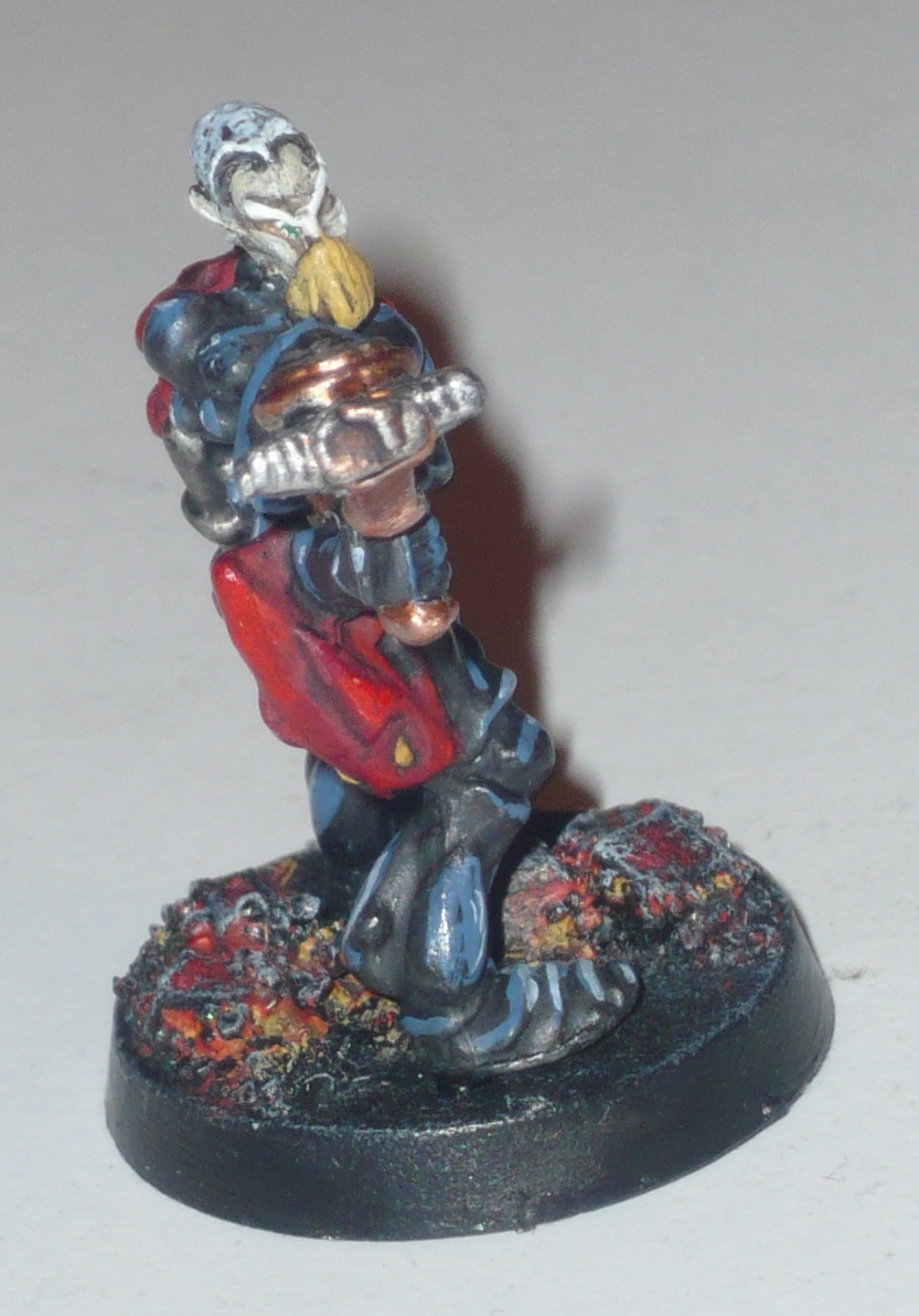 I'm pleased with the overall appearance of this guy on the table, but up close I am not hapy with the black. I tried a painting method I'm not used to, and it does not bear close scrutiny. I need to be able to paint thinner lines, and do it more cleanly, smoothly and accurately. Still, practise makes perfect. Can anyone give me any advice on how to do the black better? Next time I may start with a dark grey, highlight up with lighter greys and use a Badab Black wash last instead of before highlighting.