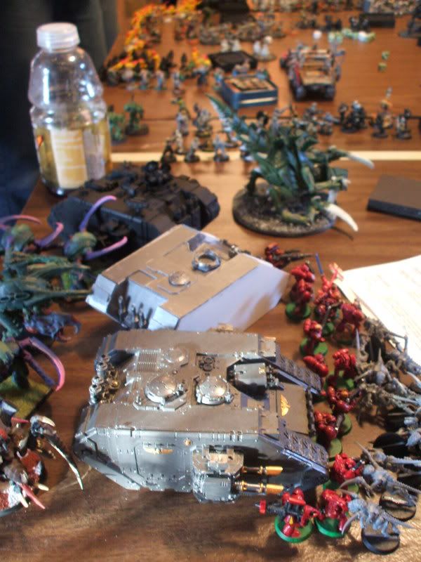 If there were no disruptor beacons and no pulsars I think the long way could have worked. Think about how many Carnifexs, Tygons, and Barbed whatevers got disrupted to the far side of the board and how many tanks/terminators got sent back to our side, not to mention how long the terminator loaded landraiders stayed parked. There was potential to get the whole board into play this way it just got stopped. Long ways would have been a very different game with pulsars hitting both teams due to scatter and them getting to our lines, the organizer was the pulsar nut so maybe that was a factor in the battle direction. I believe one pulsar did die during the alpha strike, but one out of 19 didn't really help much.