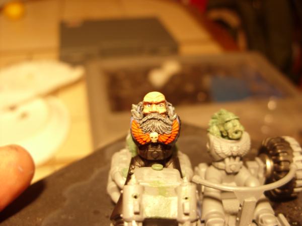 Howling Hamish is the oldest Blood Claw Biker there ever was. Many moons ago he did work his way up the ranks, and served some time in the Long Fangs, but alas, he suffered terribly with arthuritis in his knees, and carrying a supersized plasmacannon proved to be too much. Lord Ragnar recognised Howling Hamish's heroic efforts, and allowed Hamish to transfer back to the Blood Claws, where he could blow the %@*# out of people from the comfort of the sidecar of an attack bike. Hamish agreed on one condition.... that he could take his younger brother 'Ubi Wan'. Ever since, they have been a true force to be reckoned with, and an inspiration to the younger Bloods. (it's all in the 'Lost Codex'..... but that got lost, so you probably havn't had chance to read it)