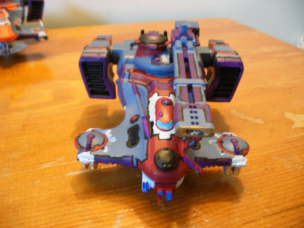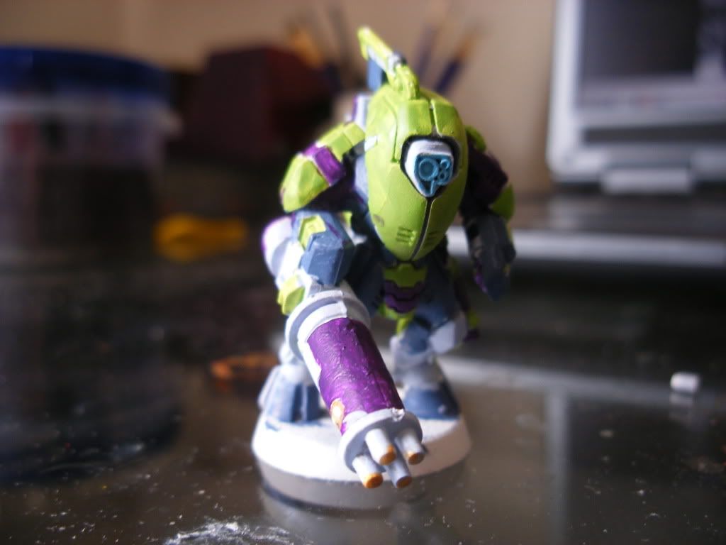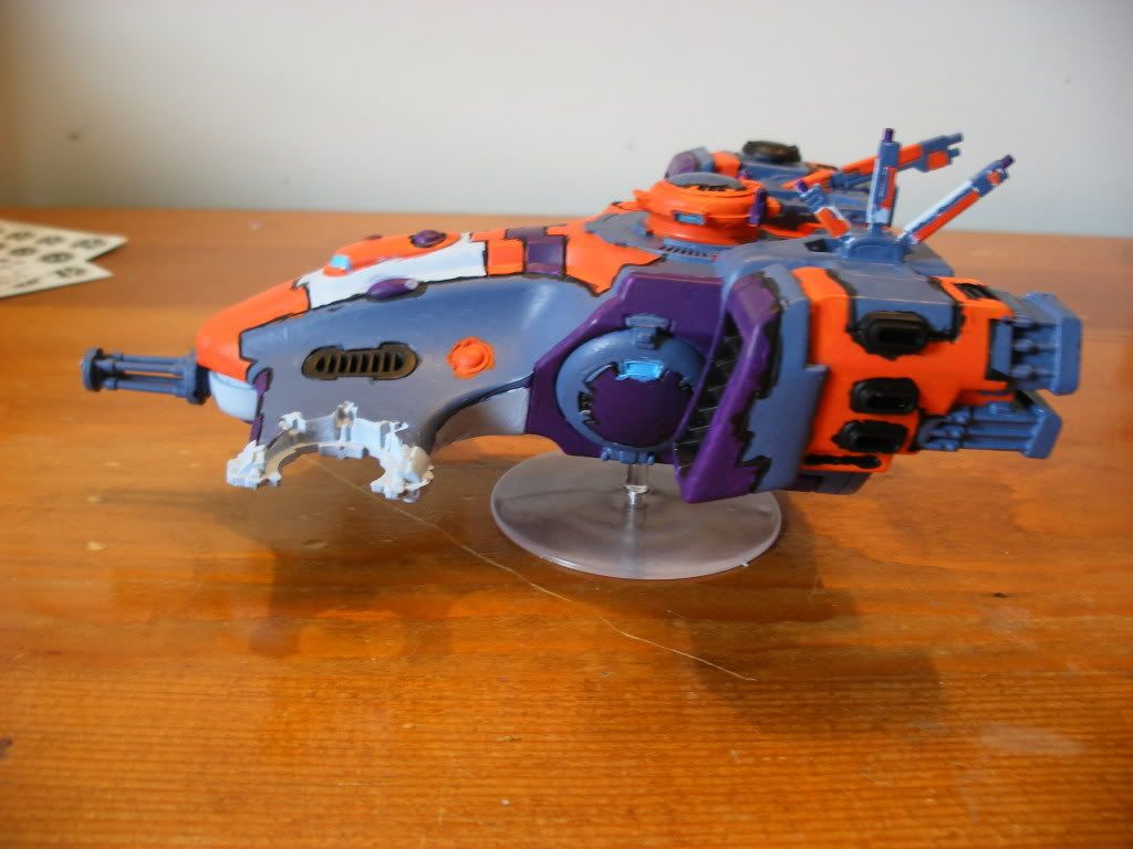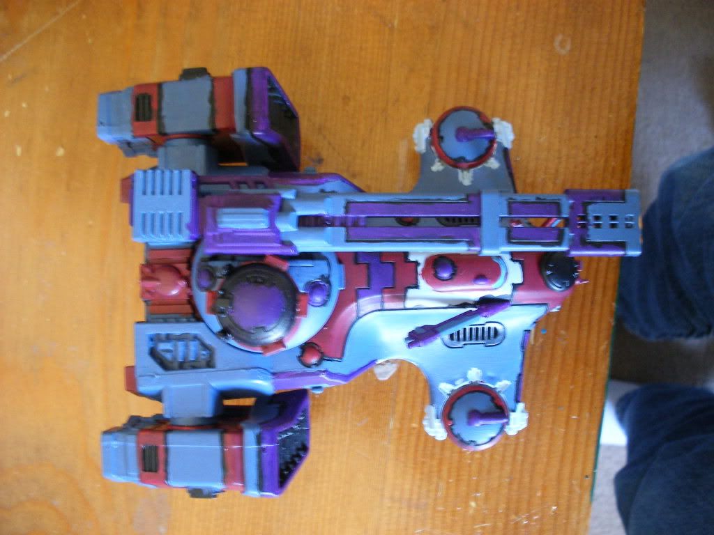 As for the paintjob, I'd work on painting right up to the lines - as it is, it looks a bit messy. I'm not much of a fan of the orange as a colour, but the purple and blue work well. Keep at it!