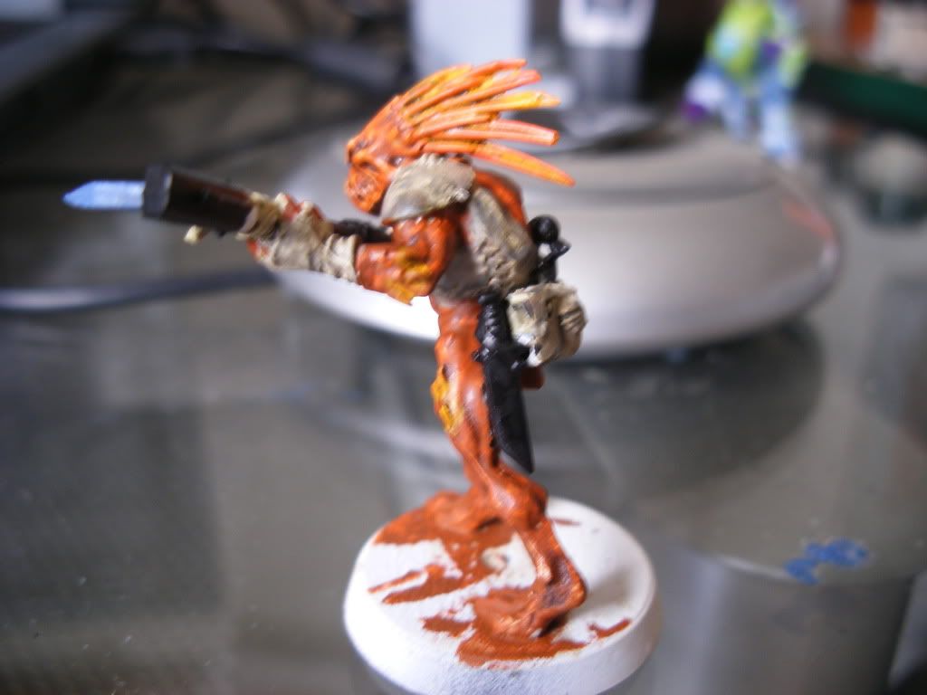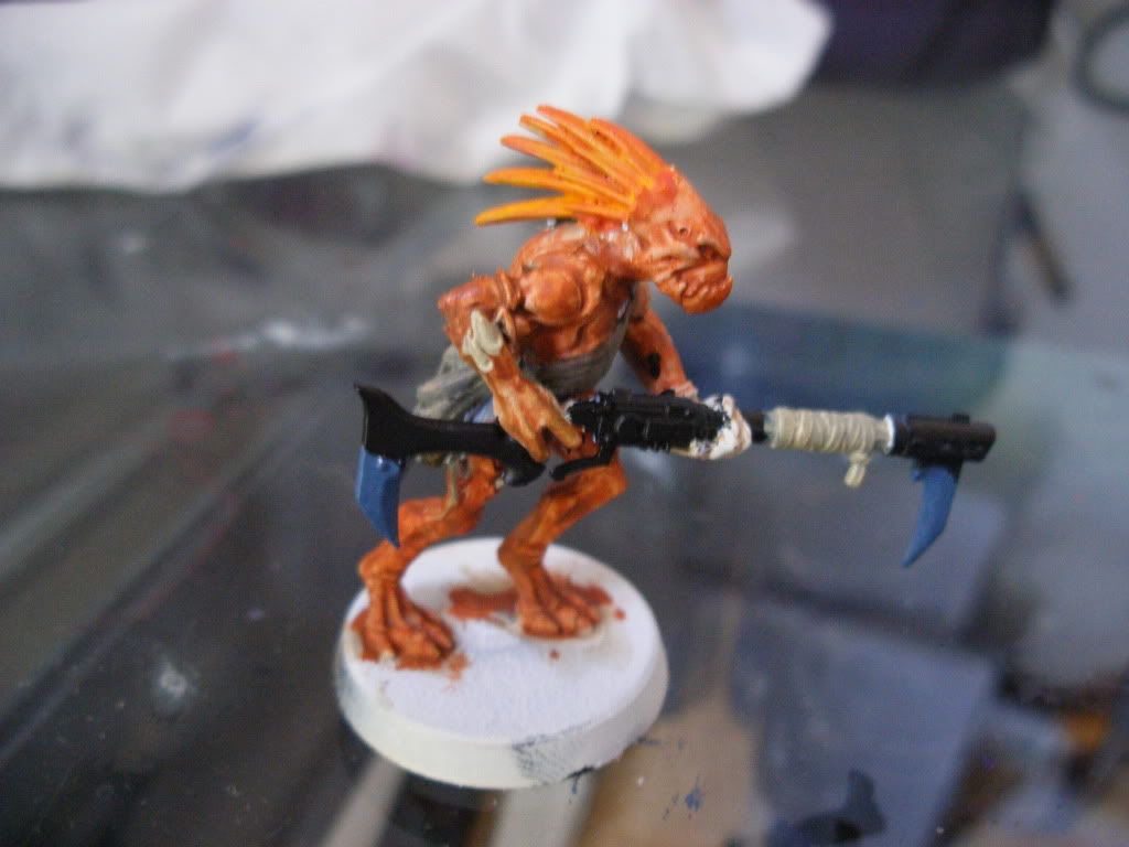 Well I have most of the vehicles done and will get some pictures of them later. So I now have two fishes and two hammerheads done. I am taking a break from painting vehicles and saving the monster that the sky ray is going to be for later. So now I am moving on to the troops. First are the Kroot. I love these models and how they look, even if making them can be a pain sometimes. What I have here is a test model. So it is not neat and not completely painted. But it gives me an overall idea of where I want to go. I used white primer again for the model. Next is a watered down Commando Khaki followed buy a watered down vermin brown. The quills are vomit brown the blazing orange orange and then golden yellow. While the quills on the body are not colored this way I will do it for the rest of the models. The equipment is catachan green with commando khaki. The blades are shadow grey, the gun is black and rotting flesh for the wrappings. For the body and the quills I am going to water down the paints and try to keep the uneven coloring.
