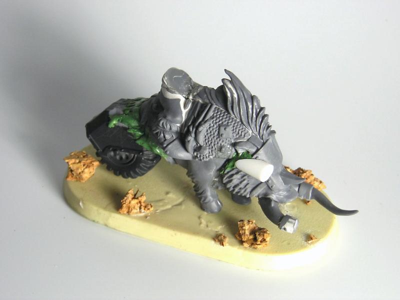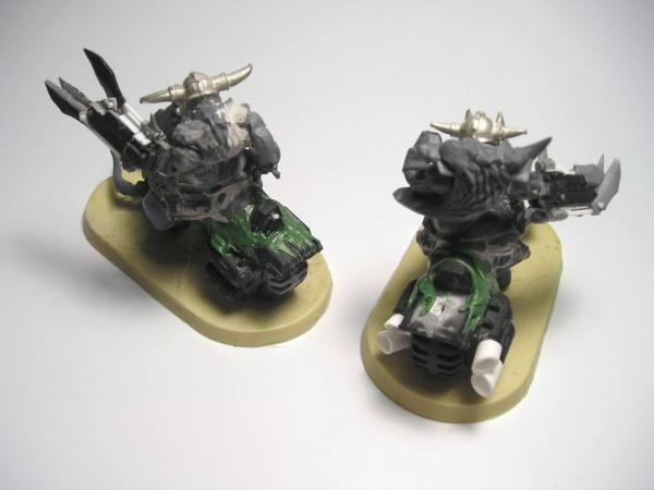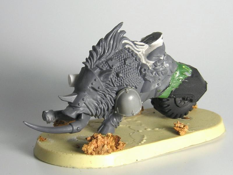 As for the Cyboars, I was going for the old cyboar look. And while it would look interesting to do the bike covered in boar skin approach (by adding a front wheel), I think it would end up looking like "a bike covered in a boar skin". Hmm, might just have an idea for a transition to Speed Freaks army in the future.