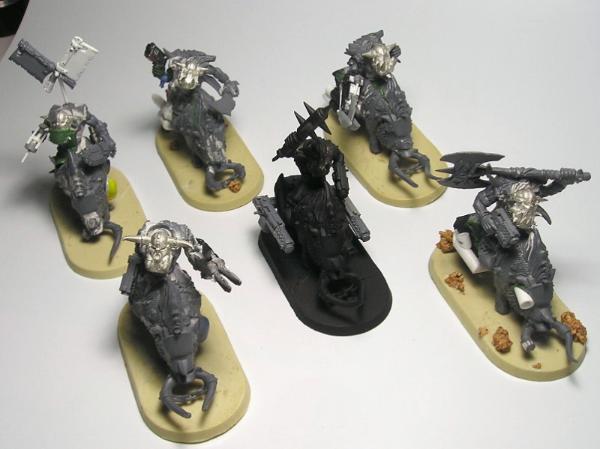 Alright, I got most of the work done on four more Nob Bikers. That brings the total up to six, including two with power klaws and a painboy.