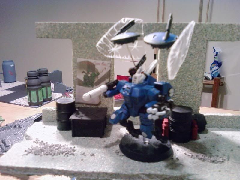 This is my new tau commander, converted shield drones and commander, most notable bits being his head and the cyclic ion blaster I made.