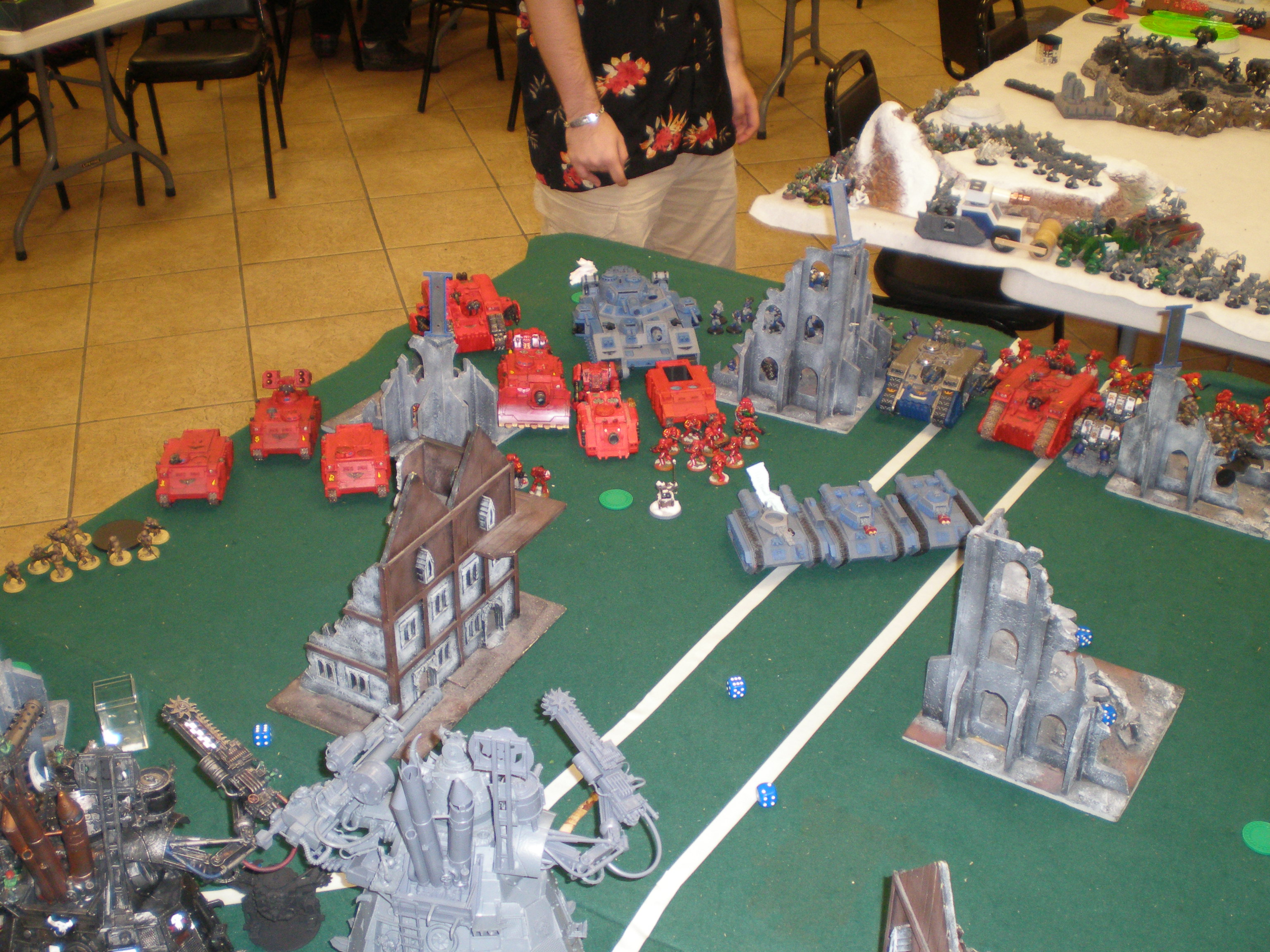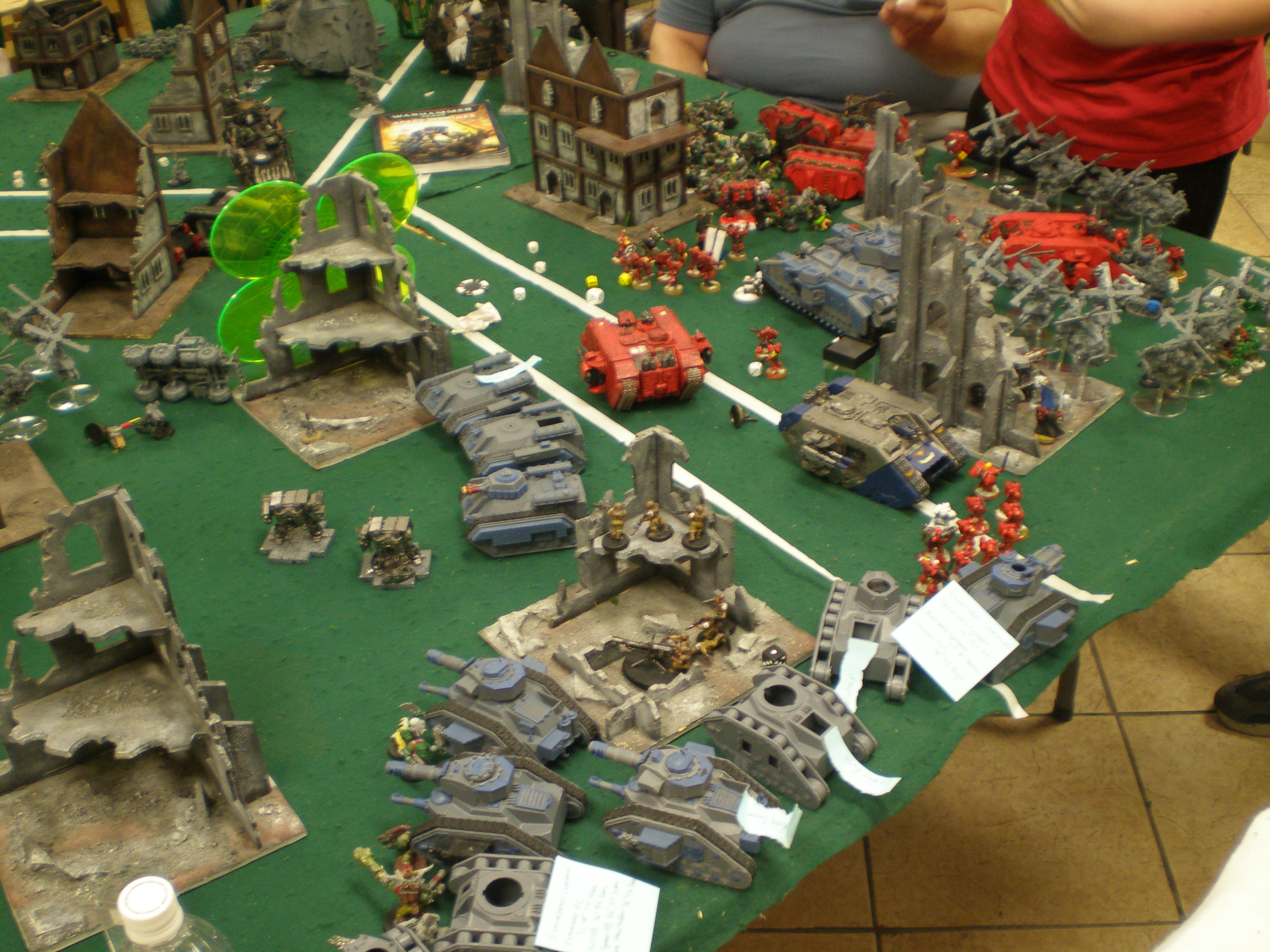 Imperium side had a very tank heavy force of 2 Baneblades variants, Hellhammer and Stormsword, 6 vindicators, 10+ Leman Russes, 3 Land Raiders, 40 Guardsmen, Sicarius and chaplain led Vanguard squad, 50 marines, 4 dreads, Callidus assassin, 2 squads of Grey Knights, 7 terminators, 3 hellhounds on main board. Mountain had a 3000 pt Black templar army.