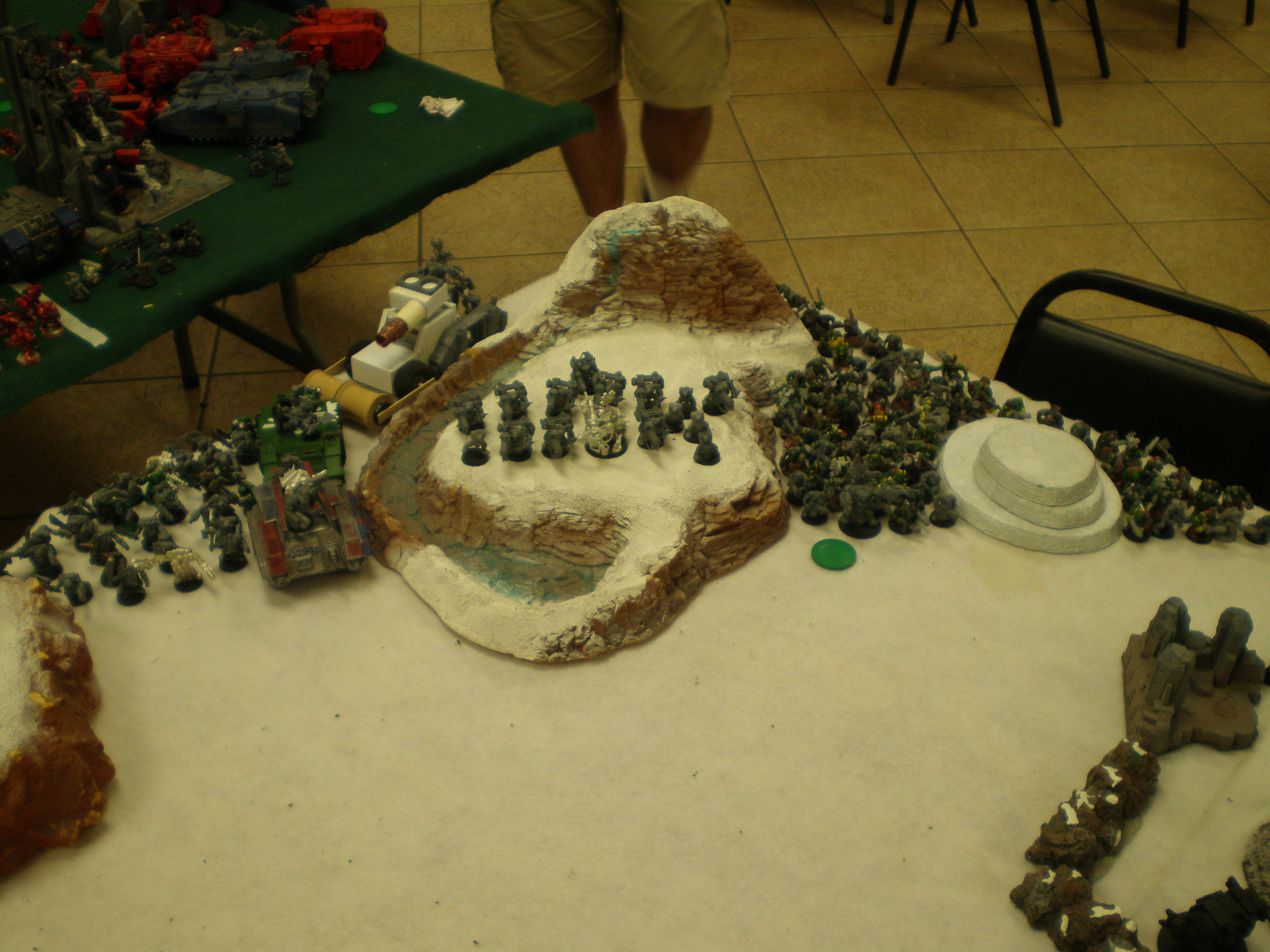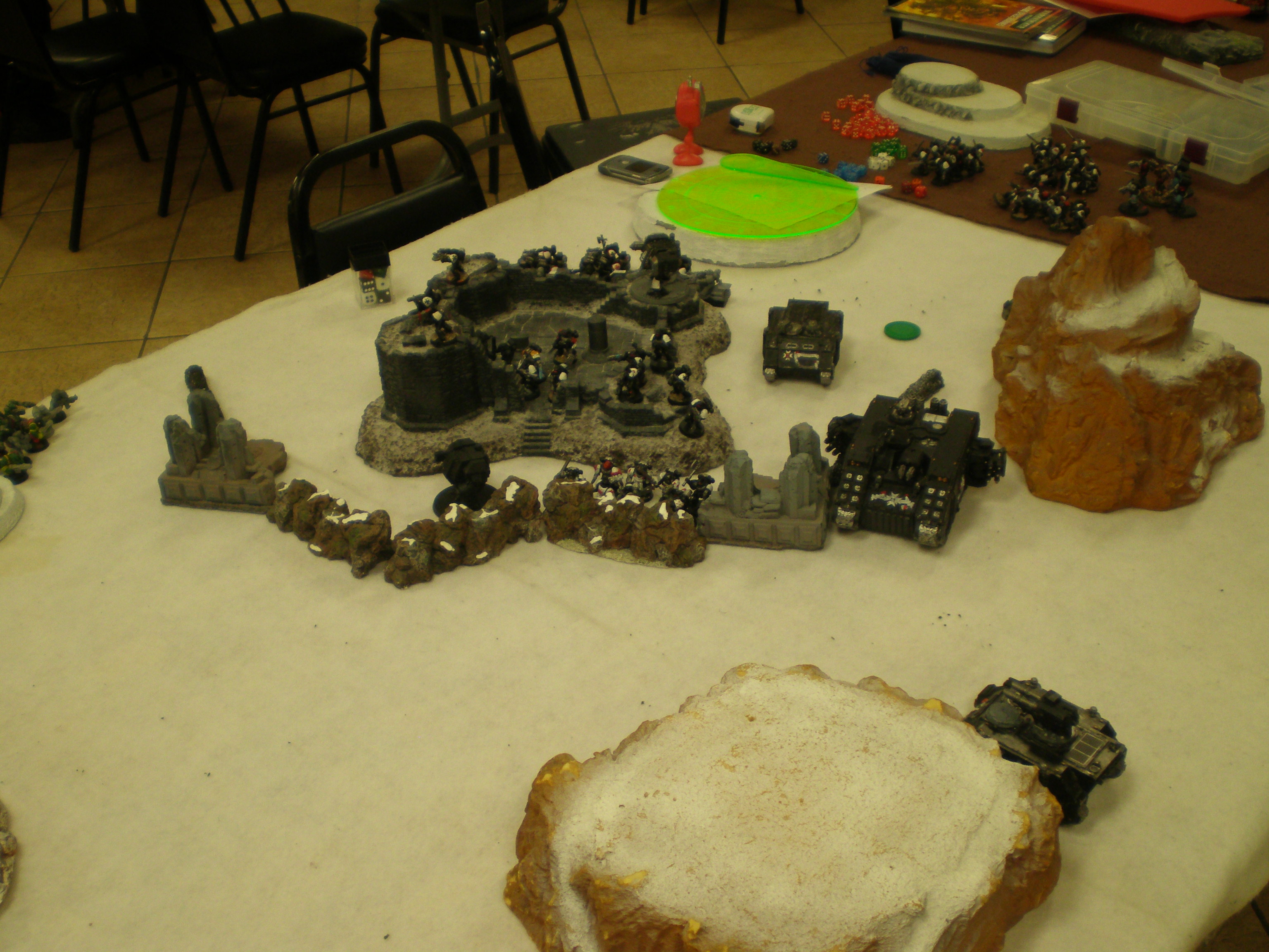 Long story short. I set up game with a 6'x8' main table and a 4'x6' side table. Big board was main table with the Y road forks being the Ork side reinforcements entry points. The side board was a snow covered mountain, whole table counted as difficult terrain. On mountain the Imperium held a comm link ruin. This ruin allowed them to call down an orbital strike (