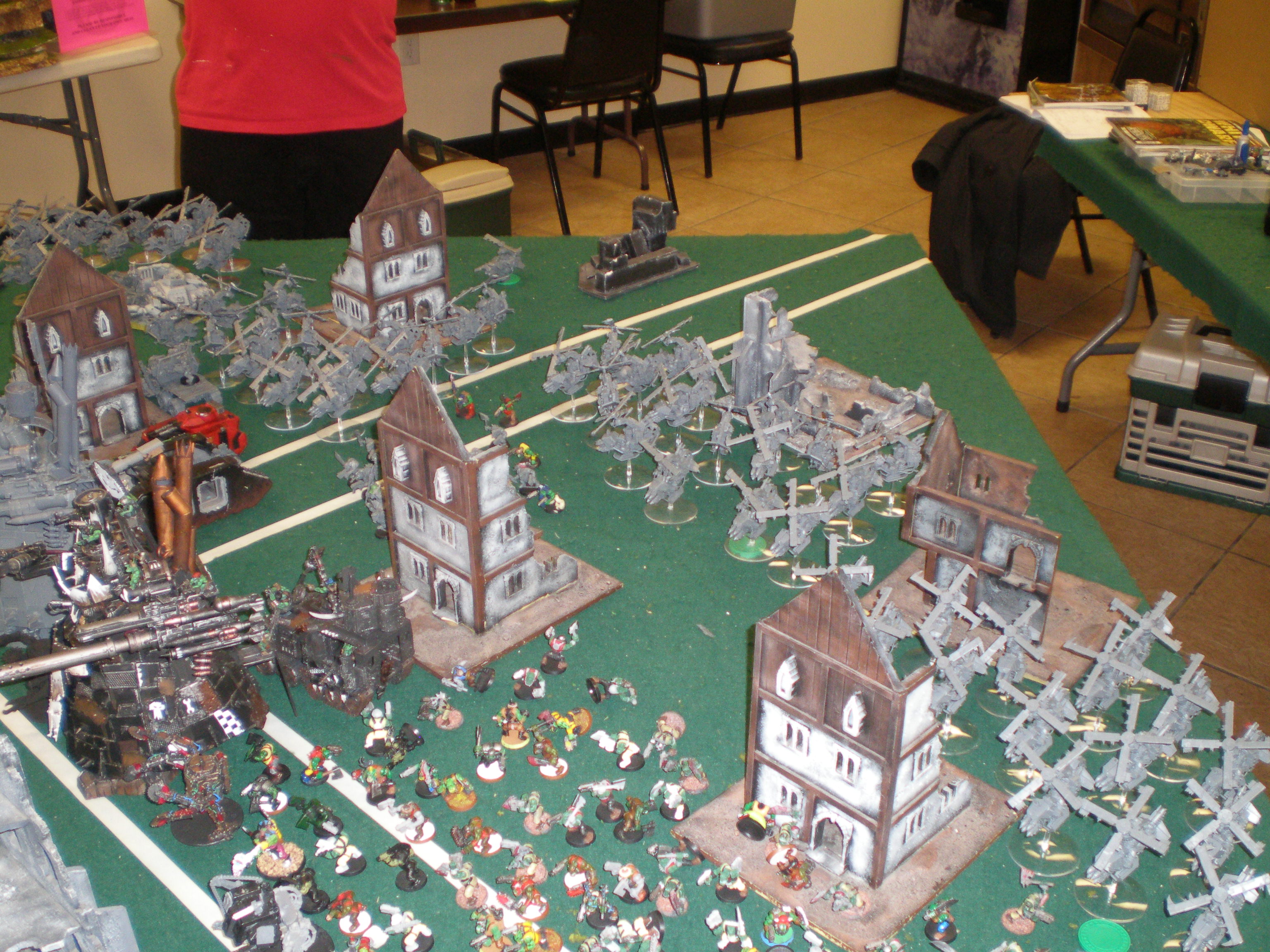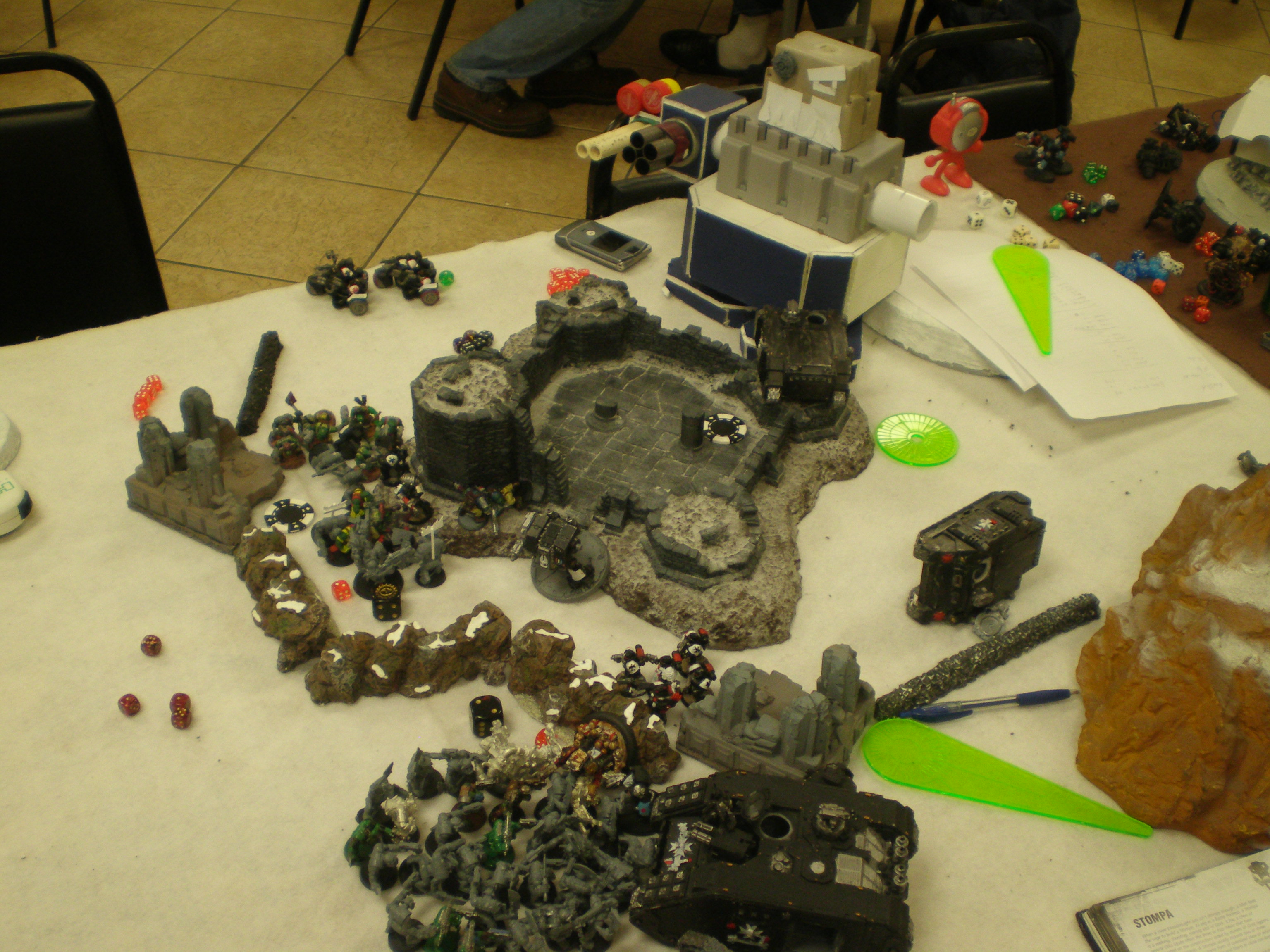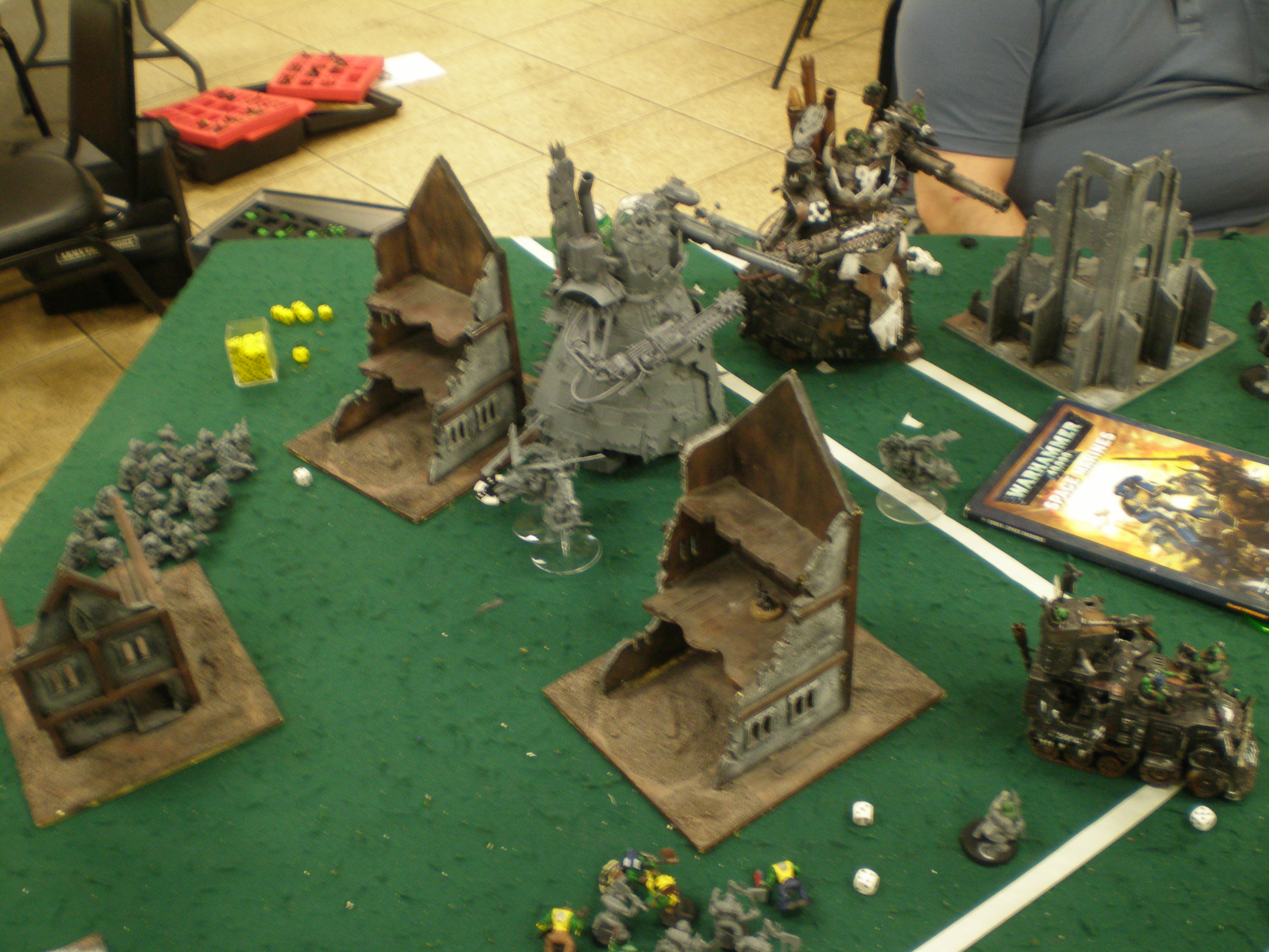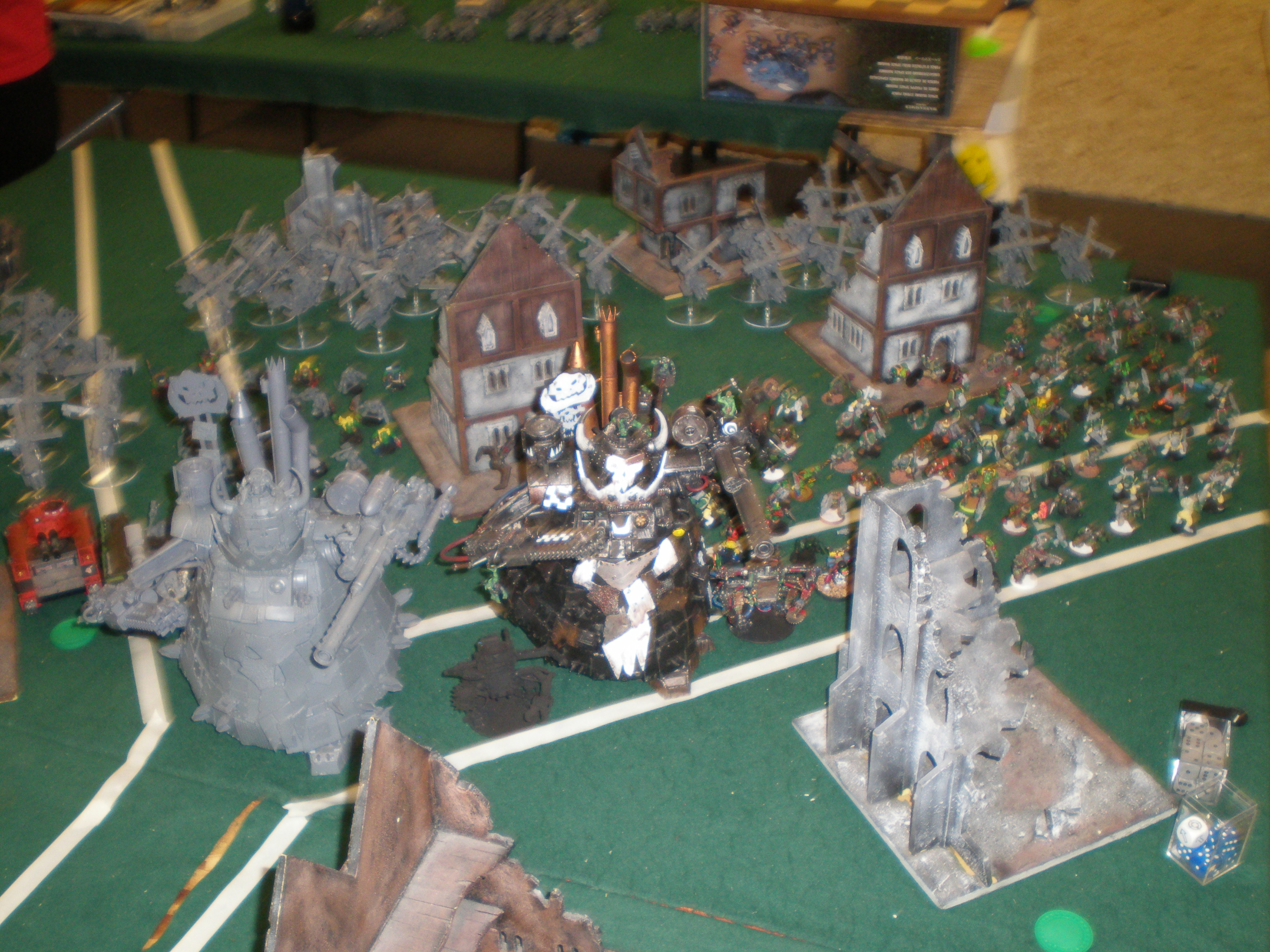 Orks had 2 Stompas, Mek stompa with belly gun (aka Mr. Winkie) and normal Stompa, 4 -15 bike big choppa effcopta squadrons, 3 Green Tides with slugga/choppa boyz and War Boss w/ squig klaw, Battlewagon with some poorly armed Nobz, Battlewagon with fully kitted Nobz, painboy, Ghazkull, 5 lootas, 5 tankbustas, 5 poorly armed Nob bikers, another 5 tankbustas, 10 Nobz and Mek with