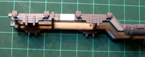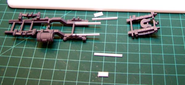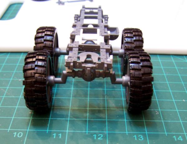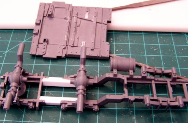 I’m going to chop the frame of the trukk just between the two rear leaf springs and elongate it using styrene L and/or I beams from Evergreen Models. It will only be lengthened about 10mm+/-. Once this is done I will also have to elongate the bed of the truck a bit. I will probably do this from the back as not to screw with any of the side mounting armor. I will decide on that after I see how it looks.