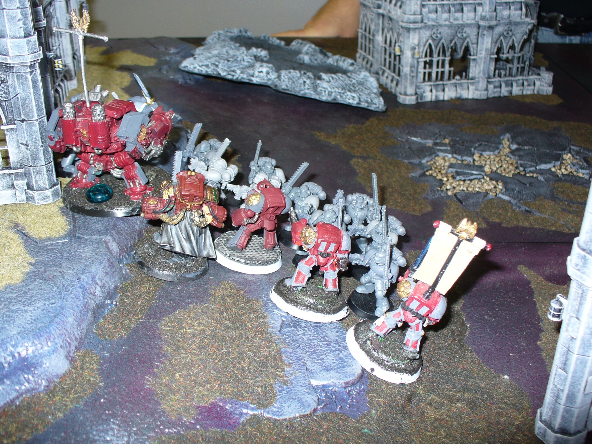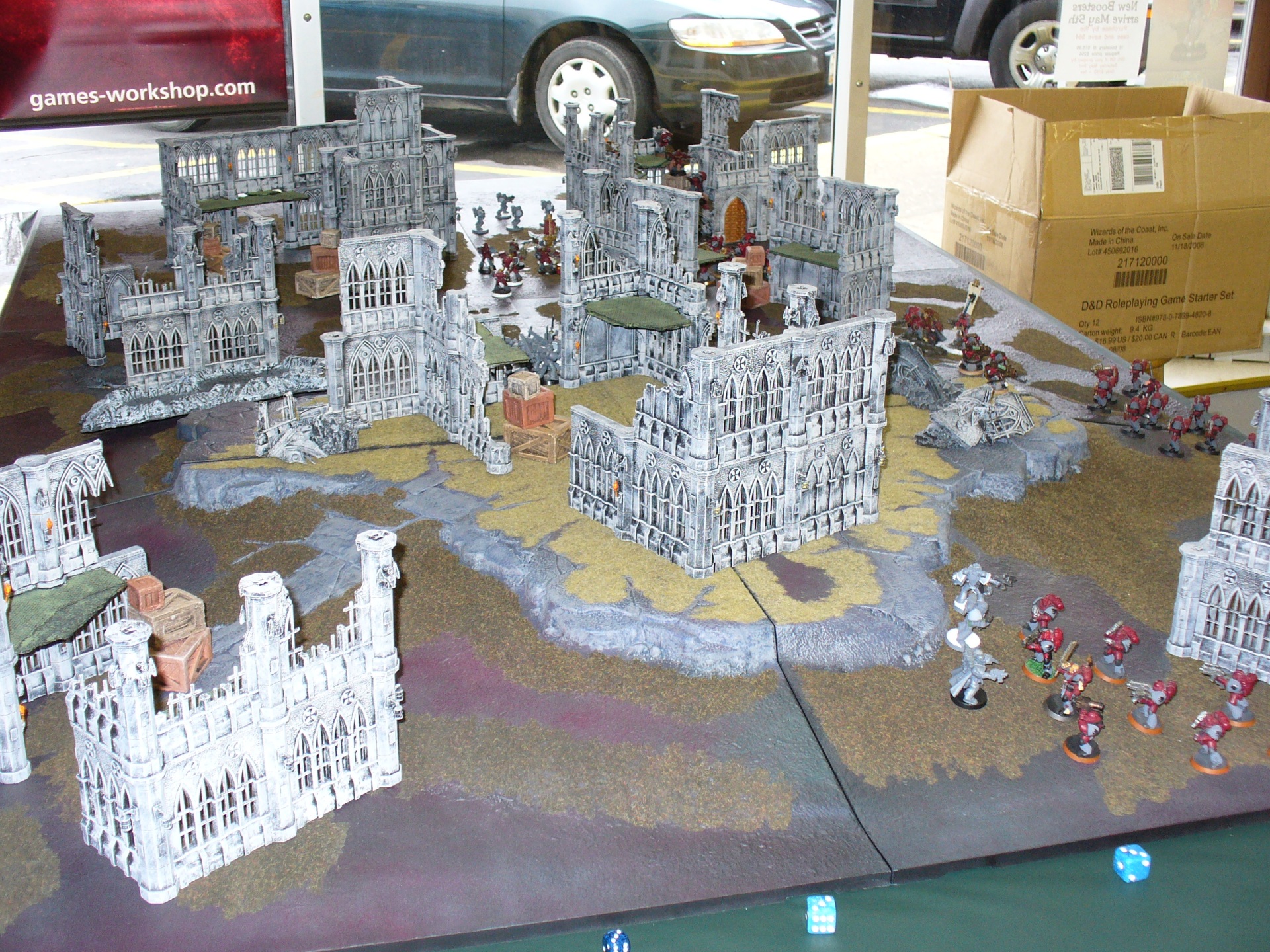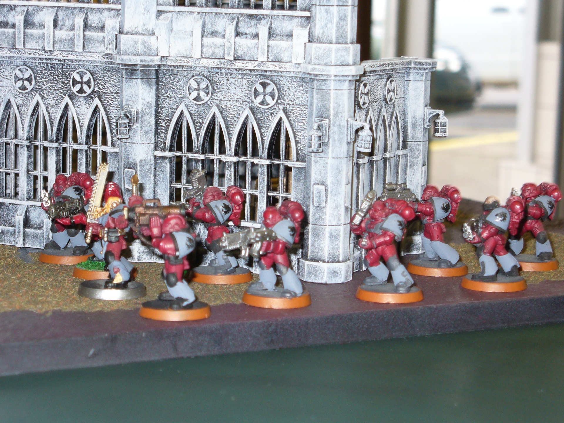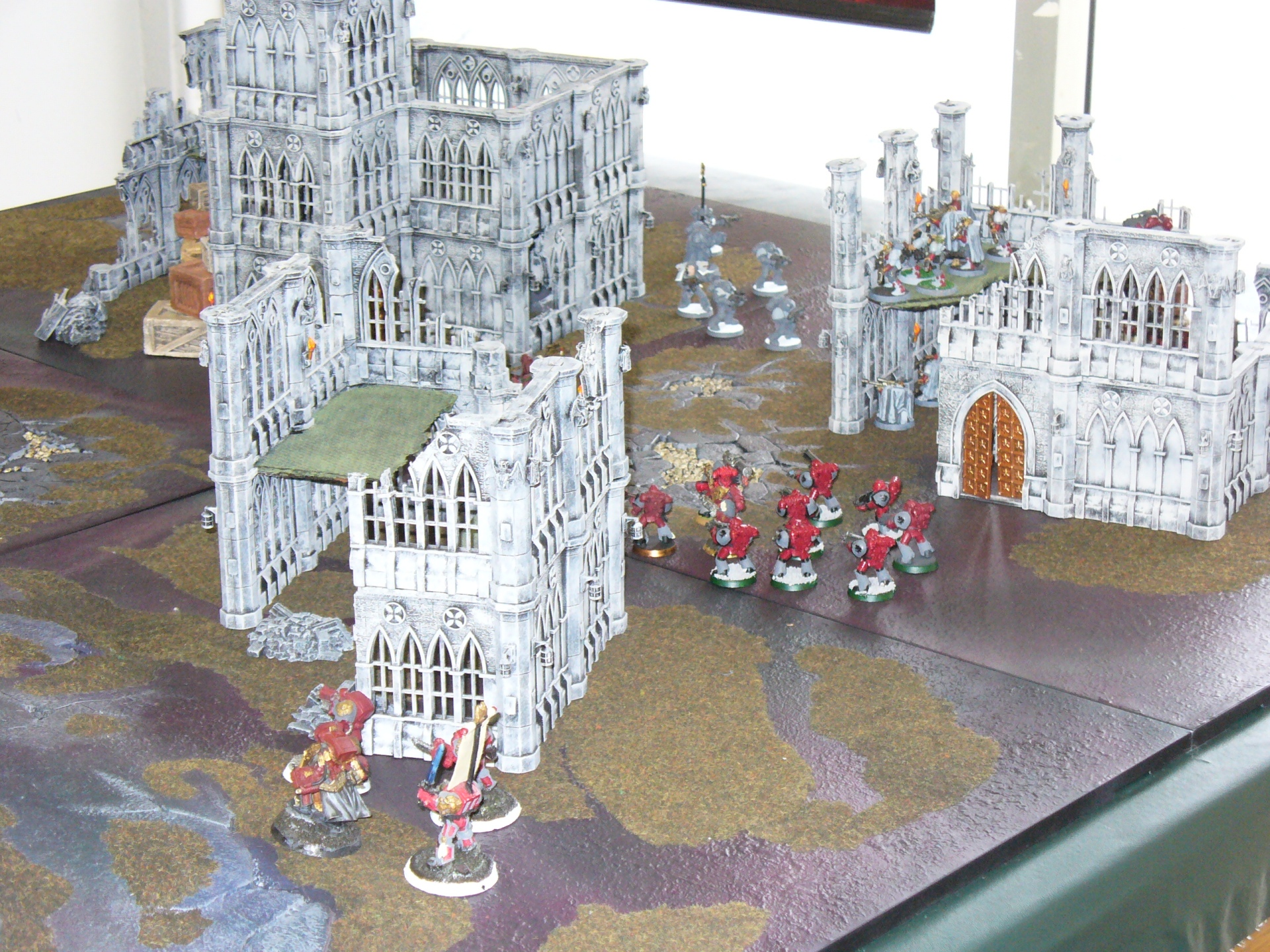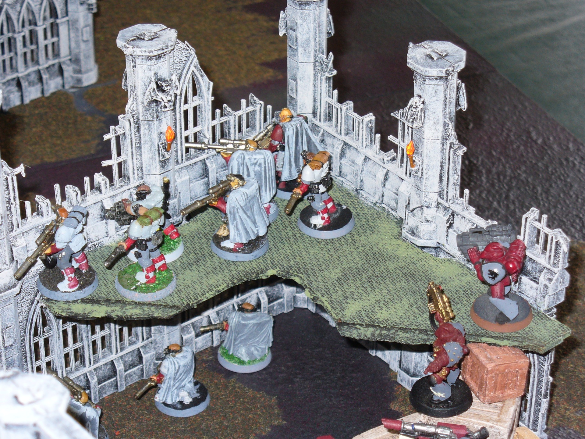 The Crimson Lions deploy with slightly heavier forces favoring their own right flank. Devastator Squad Gordun is in a building on the far right flank near the back of the building and the scouts deploy into the upper floor of the same building but to the front. The Chapter Master stands behind a building by himself, speaking urgently with the Battle Barge orbiting above. Between he and the building with the scouts the Sternguard and Tactical Squad Quinlan deploy with views towards the center of the board and of the Long Fangs. To the left of the Chapter Master but behind the same building is the Terminator Captain and the Terminators and the Dreadnought. Devastator Squad Keluch with the 4 Plasmacannons is on a hill near the center of the board and deployed a bit further forward hoping to be able to close off certain avenues of approach. Tactical Squad Shondor backs up Squad Keluch in the middle and lastly Tactical Squad Aamon protects the far left flank by themselves.
