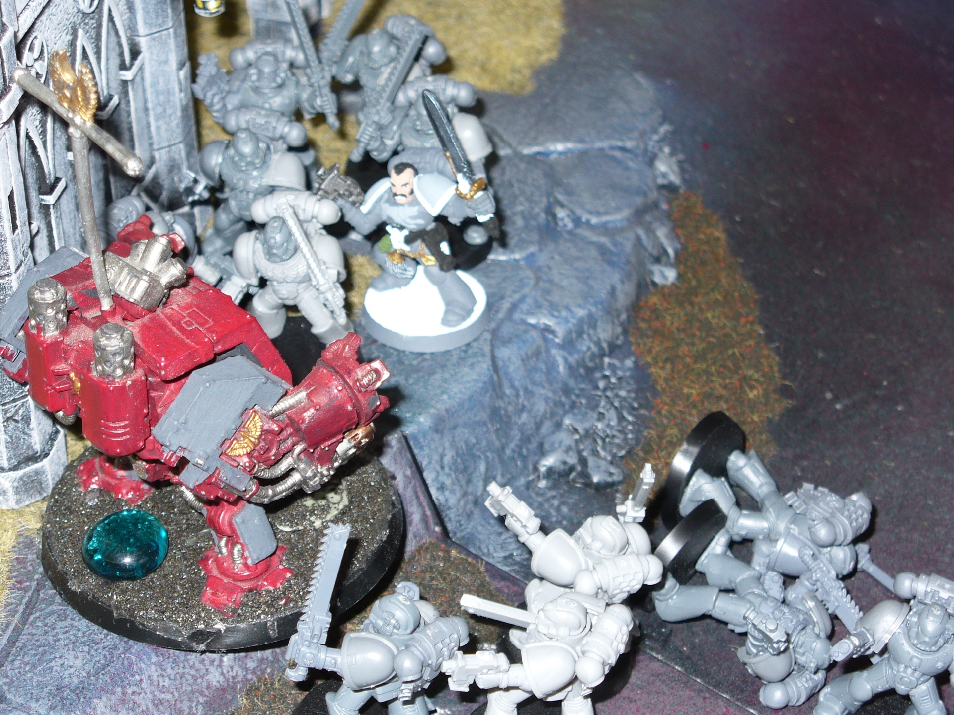 On turn 3 things start to get worse for the Wolves as the Dreadnought charges into the Blood Claws, a battle that will last until the end of the game. The Sternguard and Chapter Master after blowing the second arm off of the Venerable Dreadnought with meltagun shots, charge in and the Chapter Master rips the sarcophagus apart with his Power Fist and the Sternguard consolidate over towards the right flank and the Grey Hunters nearing the Snipers. Devastator Squad Gordun kills the final Lascannon in the Wolf Squad earning another point, the Terminators and the Captain kill the Lone Wolf scout, the Snipers manage to drop 3 members of the Grey Hunters on the right flank and the combined fire of Squad Shondor and Squad Aamon who had moved up to rapid fire the Wolf Lord and the Grey Hunters on the left flank, killing all but three of that group.