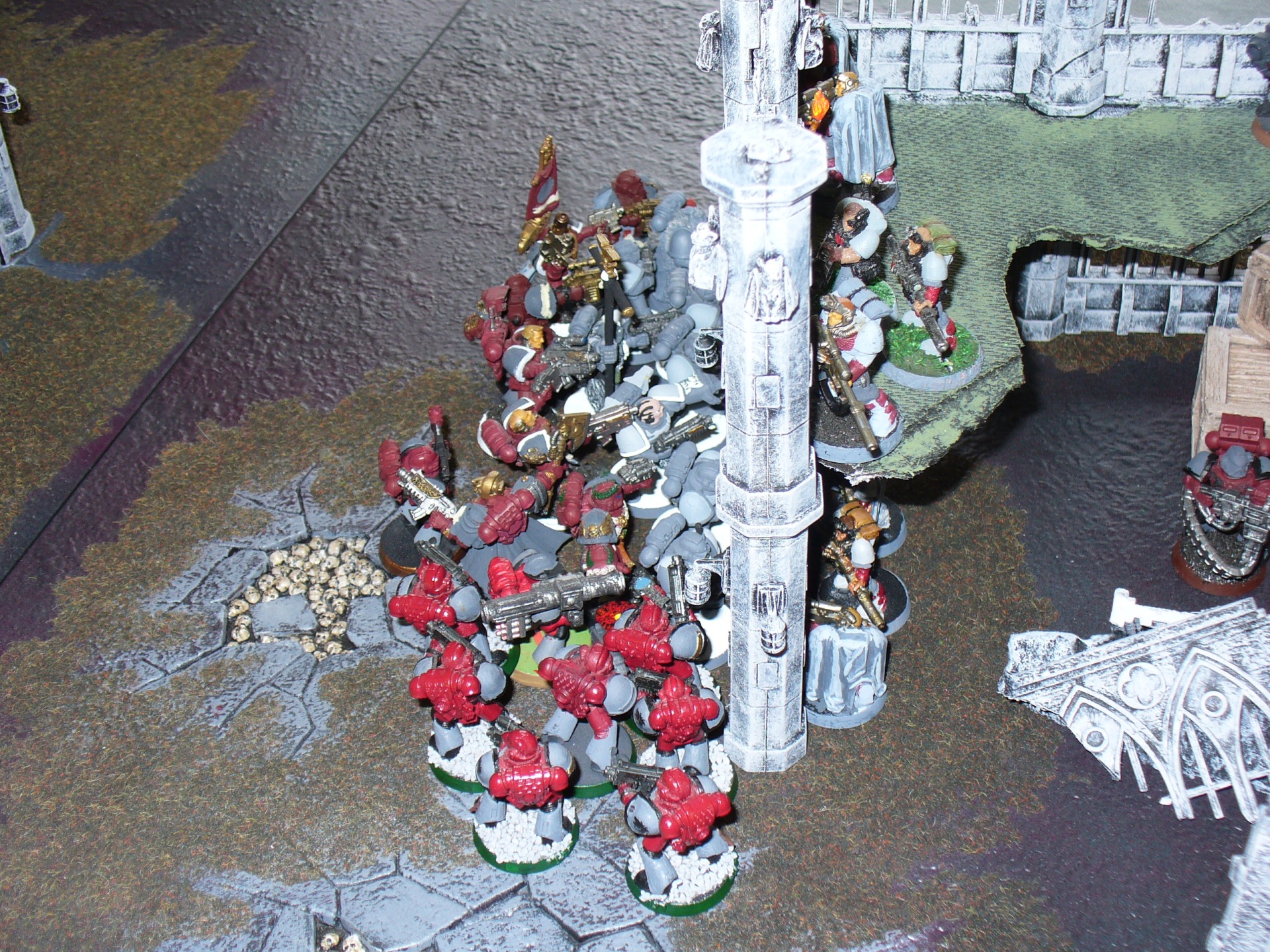 Calling down an Orbital Bombardment Chapter Master McAlister grins as a bright lancing beam of bright red energy punches straight through the top of the Land Raider, setting off its munitions in a cataclysmic fireball, a gear wheel removing the head from one of the unlucky Blood Claws as the rest of them hit the dirt. Most of the rest of the shooting is concentrated on the Long Fangs, who manage to avoid injury despite several missile launcher shots and sniper shots into the building as the armor and cover serves them well. The Missile Launcher in Squad Aamon drops a Grey Hunter on the far left but then in the center one of the Plasma Cannons overheats as the Devastator Squad unwisely targets a unit just out of range and the Crimson Lions lose their first man to a fatal equipment malfunction.