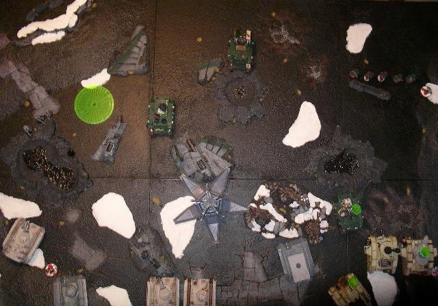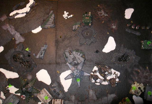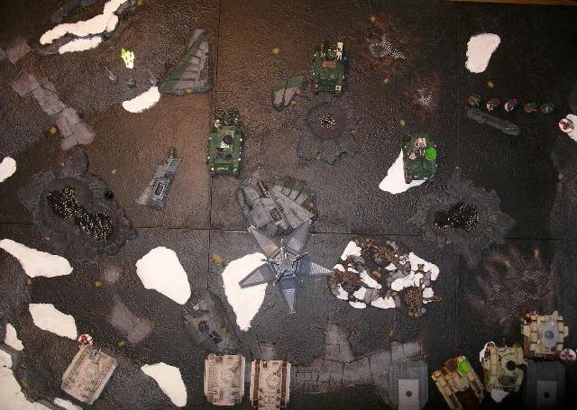 devs and the 5 man missile launcher unit and runs them into their firing positions. He moves his vindicator up as far as he can on the right extrme table edge.