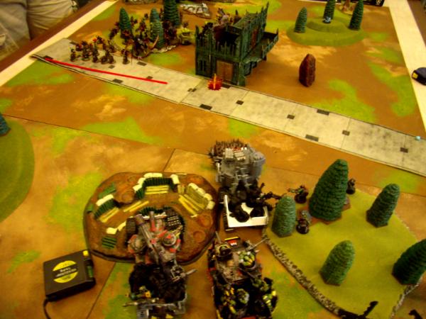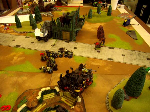 The Set up: We are playing with 4 objectives, one behind the green building, one you can see on the small hill to the upper right, one in the forest that's behind the green building and swarming with nids and the final one is right in front of my Battle Wagon in the trench system in the lower center of the picture.