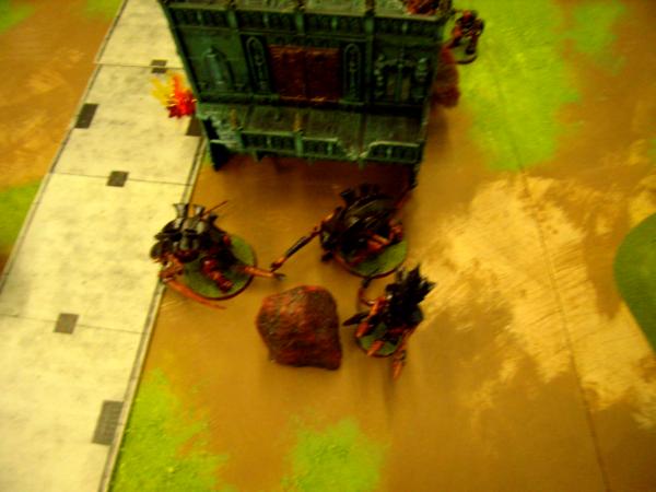 Now Jason made what I felt was the big mistake of the game on his part, after seeing the shooting fire power I was leveling at him, he balked and retreated his forces. Sending only a duo of Carnfexes and a Twin Devourer Tyrant after me, while waiting for his Out flanking Genestealers to show up.