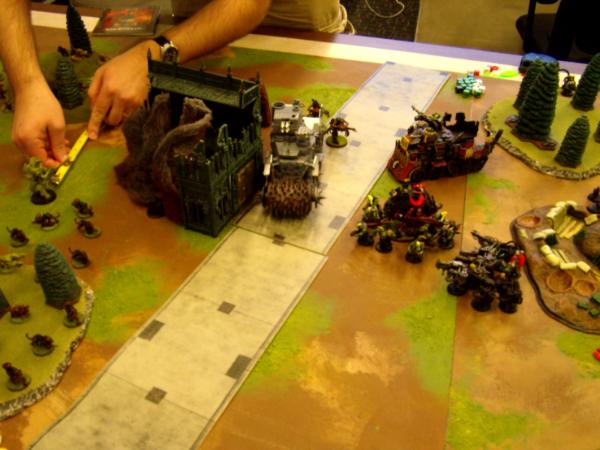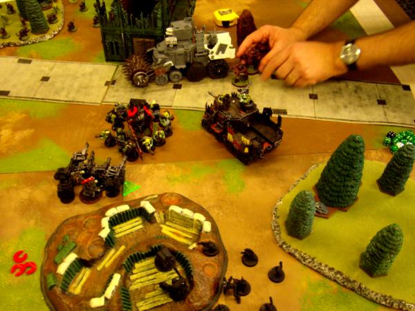 I was playing Three Battle Wagons ( one with Kill Kannon, one with 2 big shootaz and one with 4 rocket Lanchers, a Zapp Gun and Deth rolla). I had 2 2o man Shoota boyz squads in the wagons with out the Kill Kannon and a 10 man lootaz Squad in the Wagon with Kannon. My Big Mek with