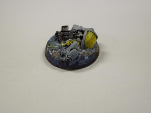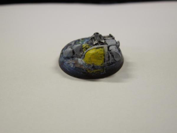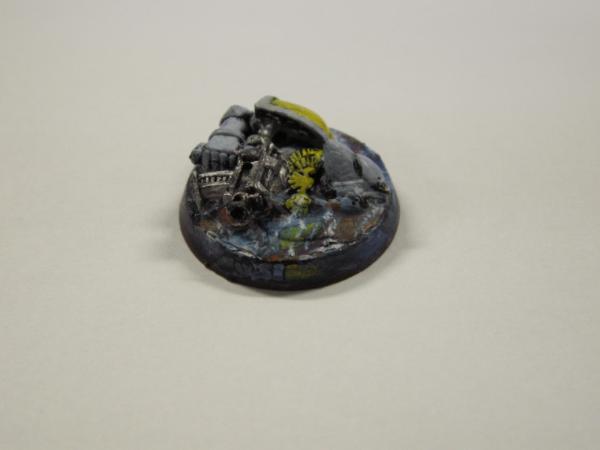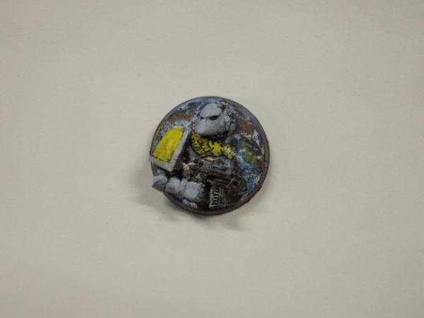I made this model by taking half of a chest-piece aquilla, the front half of a space marine head, an arm, and half a shoulder pad. I shaved them all downt o just-about line up with the base, but to sit at an angle "into" the base.