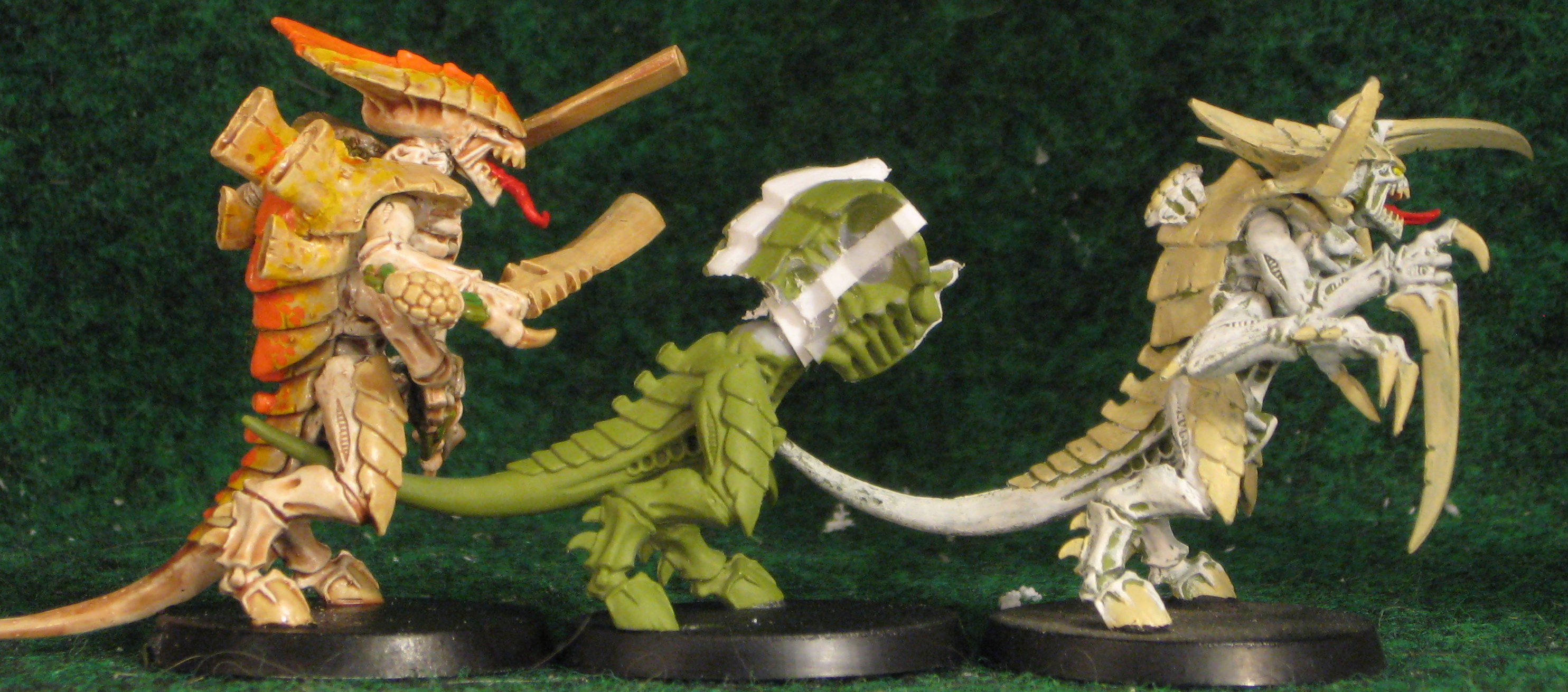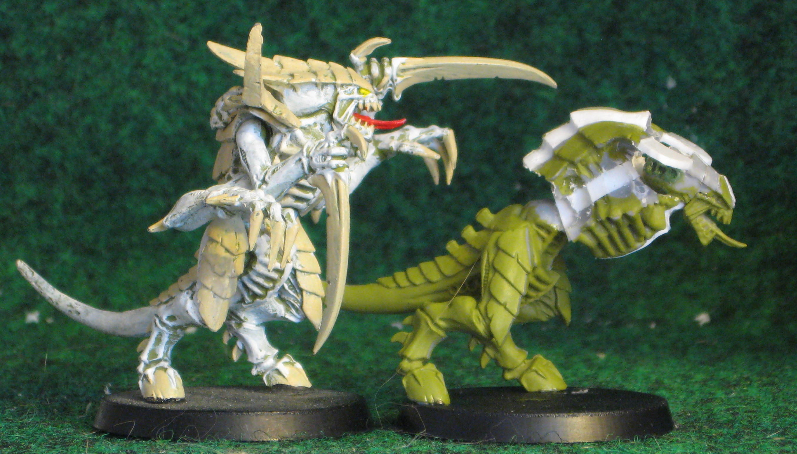At the moment, the only Non-"T" Fexes I have are two of the old old old original metal Screamer Killers. I do intend to get a couple plastic Carnifexes to use as actual Carnifexes (gasp!) and have not yet fully decided if I'll bulk them at all or not. If I do, it won't be to Nearly the same level as the T-Fexes, but just putting a single spacer down the middle, probably 3mm thickness which is a tad less than the T-Fexes, and I'll also do the 2mm to the head, because I like the wider/squatter look to it. They'll have the tusks, but not the beetle bit on the forehead.
