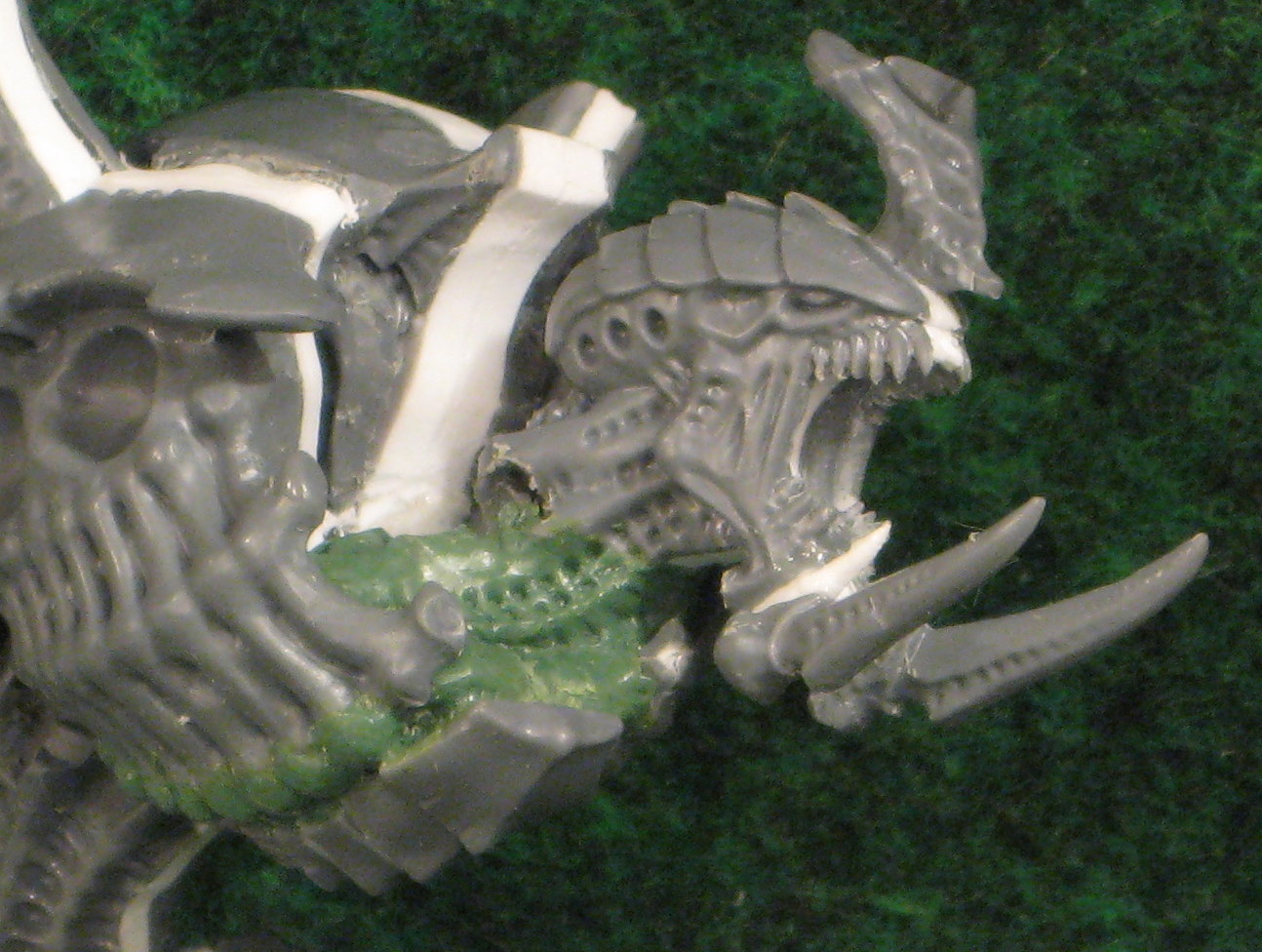 Did some gap filling on his sternum. The first one used a series of large Extended Carapace bitz to cover this up, but I don't have that many extras of those now so I used the conveniently available extra sternum bit from the Trygon kit. Making more of an effort to fill the gap with more than just flat Green Stuff this time as well.
