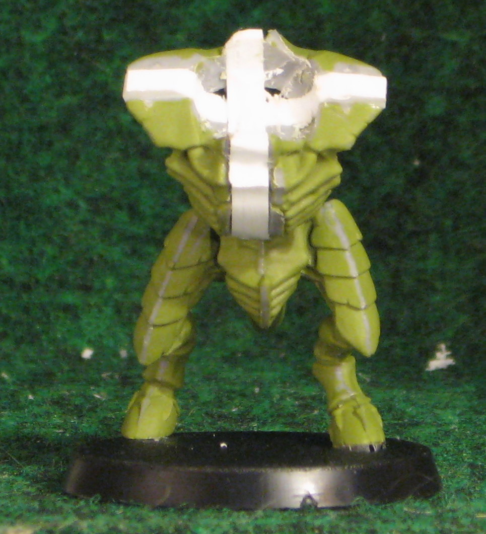 Working as fast as the slow drying plastic glue will let me! I am happy to say though that I've managed to get him to the condition I wanted him to at least attain, standing up with a head and body, though no arms as I need to get replacements for the Crushing Claws I swiped from the kit to finish Tervie. Still makes for a better fig than trying to use an old Exocrine as a proxie.