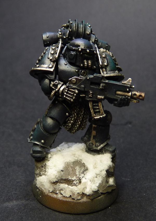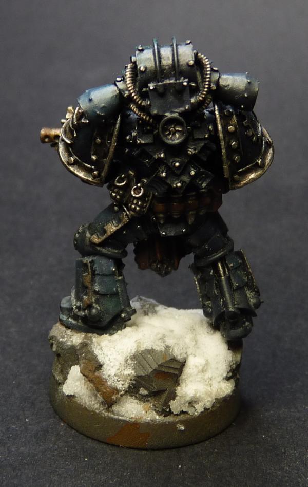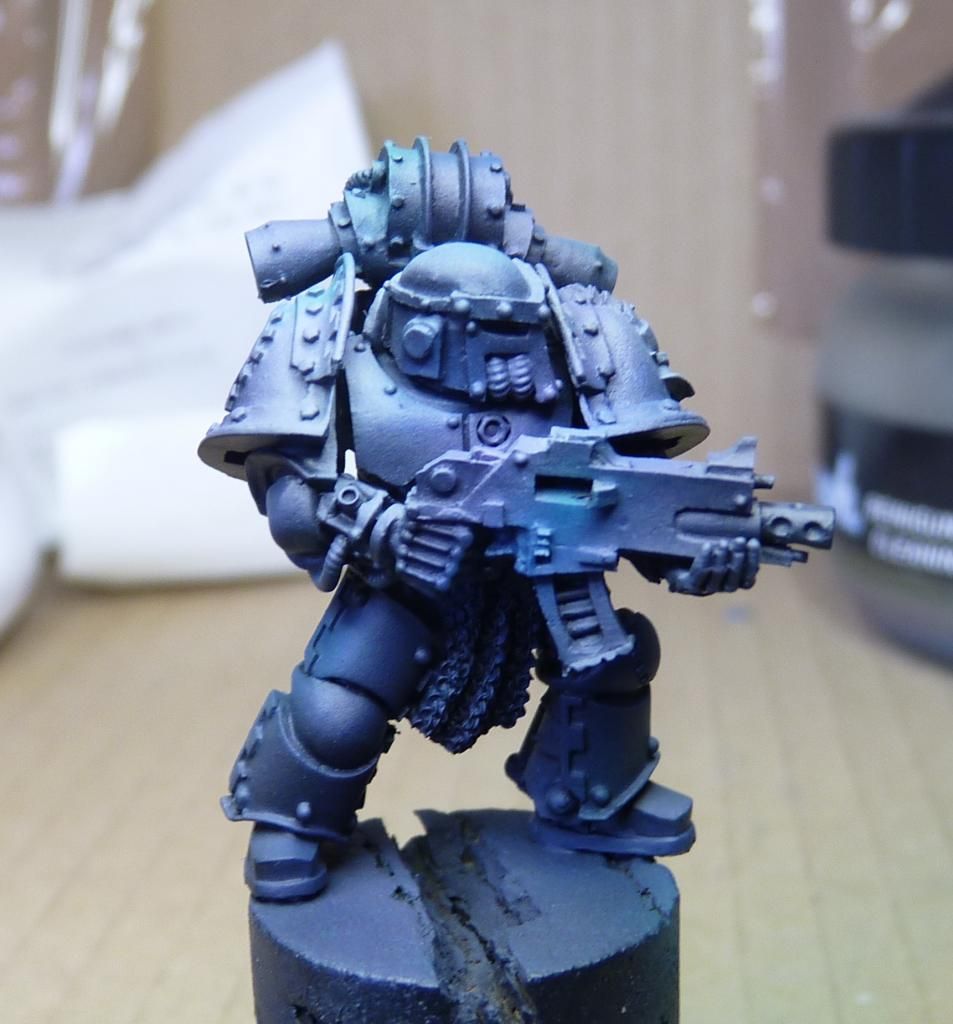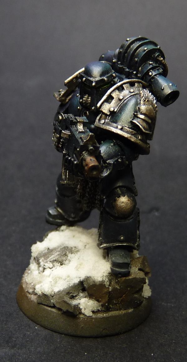 At this point i got enticed by horus heresy stuff and had a pop at an iron hand, the idea was to try and emulate that rich colourful oily black you sometimes get: there is an extra hidden element here, i also plan in the future to do some HH alpha legion and i intend to use the same jade and blues that i incorperated into this iron hand's black, as a subtle hint that they might in fact be AL in disguise......sneaky.