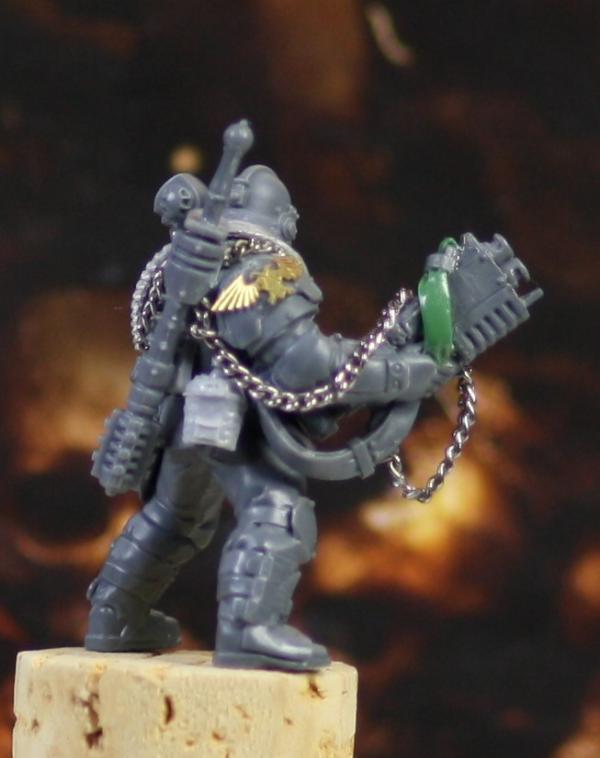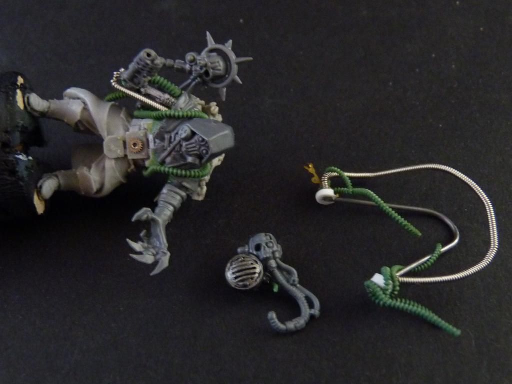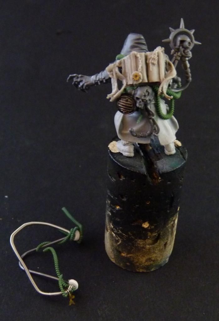 Now here comes the obsessive part of me as a hobbyist, i really liked the servo skull reading the book, but it is quite a fragile set up and I couldnt decide if it unbalanced the model too much, so to stop me having to make the decision, and so its easier to paint, I made it detachable! the best bit (and which took a reasonable amount of planning) was to make it so that in its alternative set up he could have the servo skull clipped onto his belt, (the pictures show it much better than I can explain.)