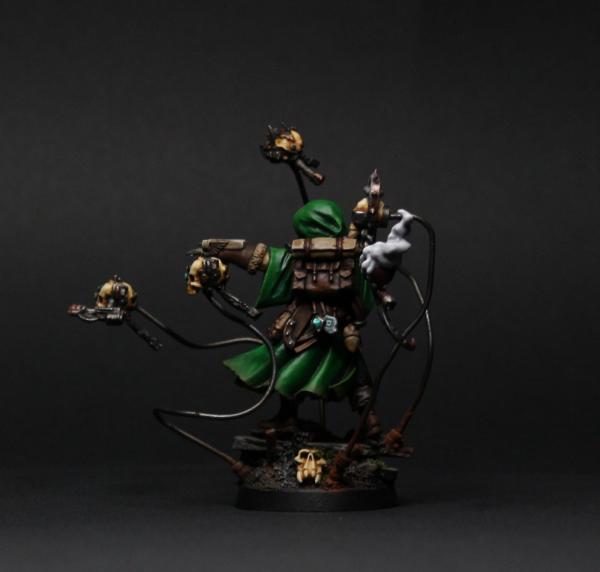So guys small update for you, been keeping to my one model at a time rule, so have done a bit more work on the next skitarii from a couple of posts back, the hunched over posture made me really think of someone carrying something heavy, so he is now the proud owner of a large book of technical data (i guess!) Once i got to this stage it was annoying me that he would have no logical way to read from his big book, so I engineered this vox-equipped servo skull to read passages to him, i think it looks pretty promising so far! That said it is still WIP atm! Sorry some pics are a bit out of focus, trying some new lighting set ups: