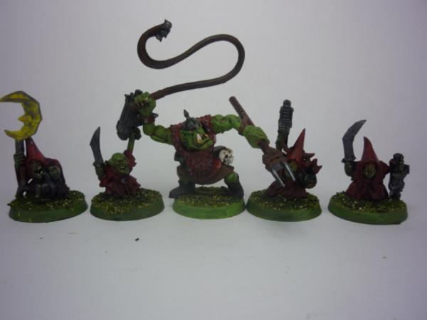I used night goblins from the skull pass boxed set for the grots. The slaver is an arrer boy with some conversion work.