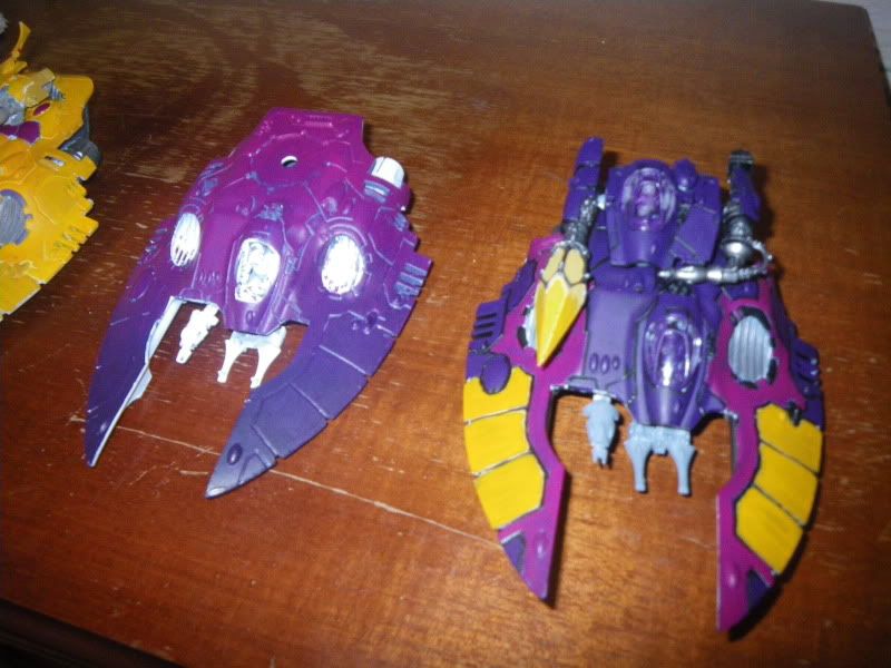 The two Wave Serpents use alot of Dark Purple because my last heavy support choice is a unit of Dark Reapers, using very dark, almost black purple for the majority of the army.