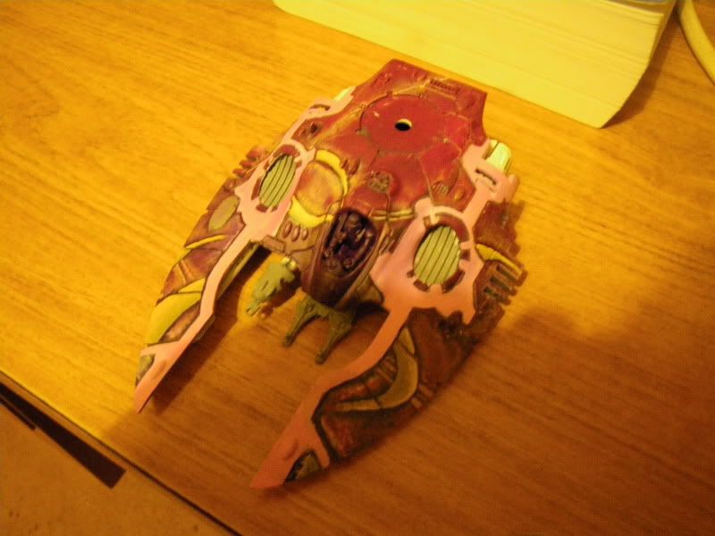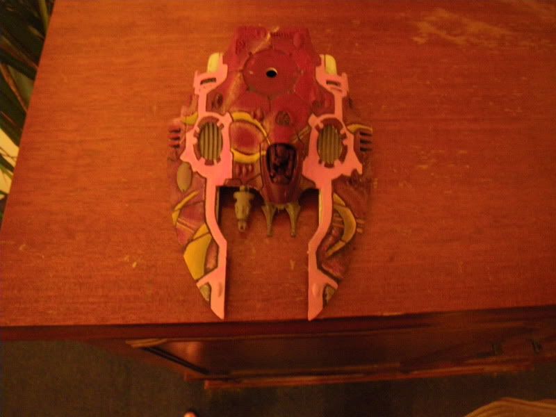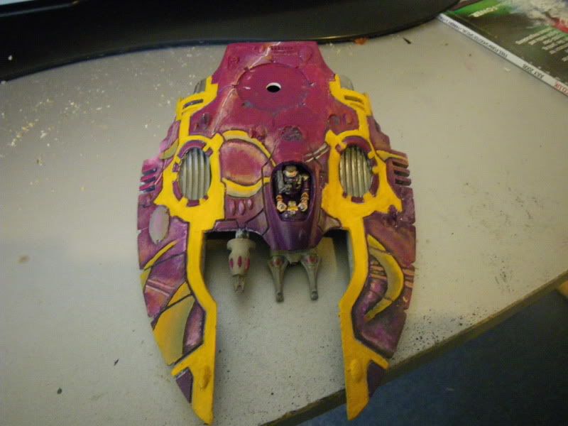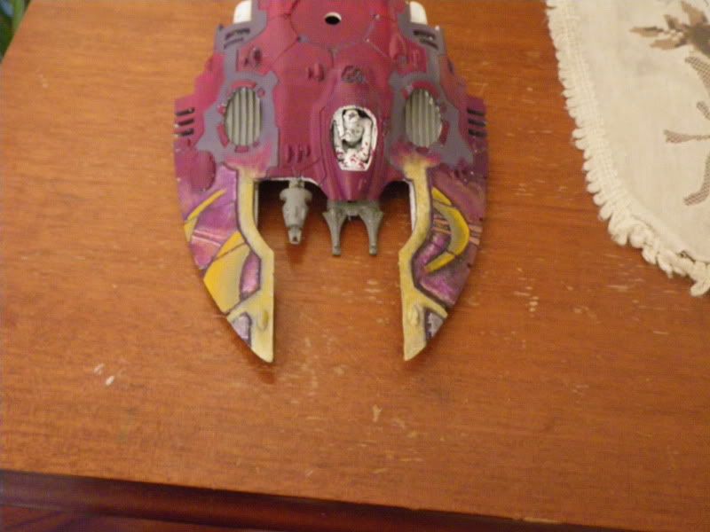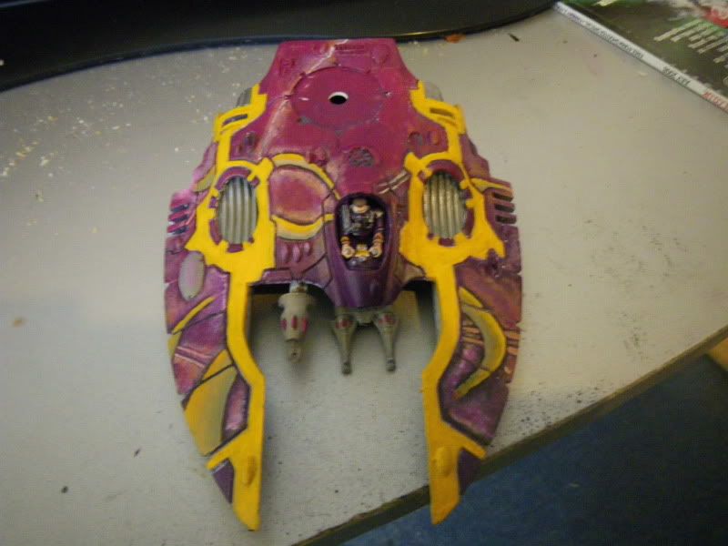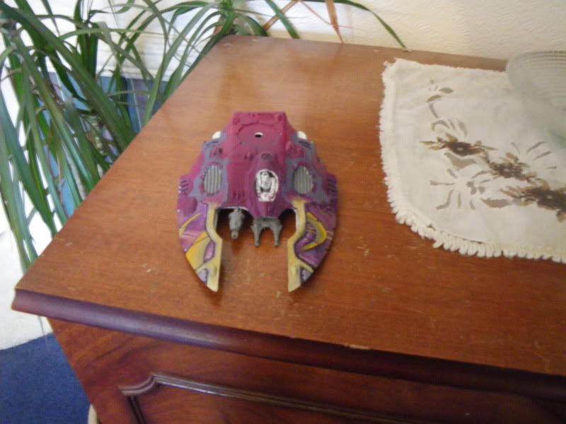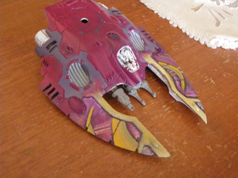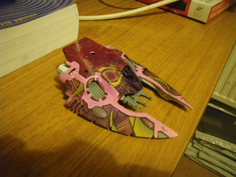 While your colour scheme is making me nauseous, those arcs you've moved onto are a very nice pattern for freehand. Please no more pink. Otherwise starting to look good, make sure you fill in those cracks! I've just basecoated two falcons and three wave serpents myself, last night. I also see you've elected not to attach the prow field generators on the serpents?