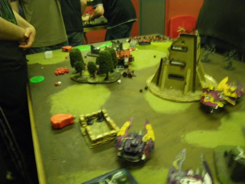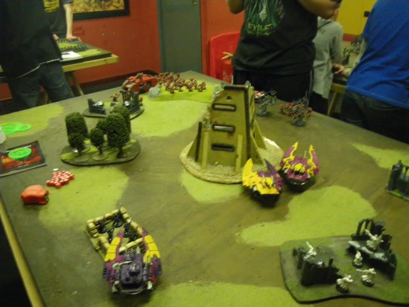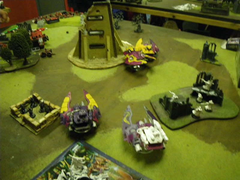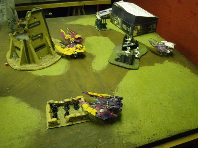 I deployed my Pathfinders in some ruins and my dark reapers in a sandbagged bunker. Putting my two Wave Serpents with farseers and Dire Avengers behind a central tower so that they were hidden from my opponents deployment.
