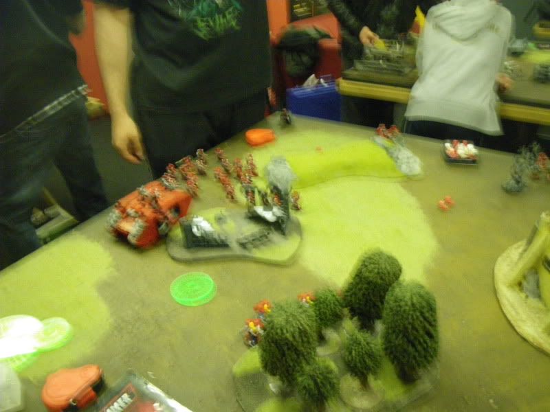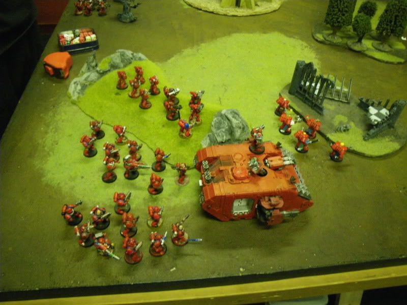 (I took this picture after my opponent had also deployed, those guys that seem to be deployed away from his army behind trees are actually inside his land raider)