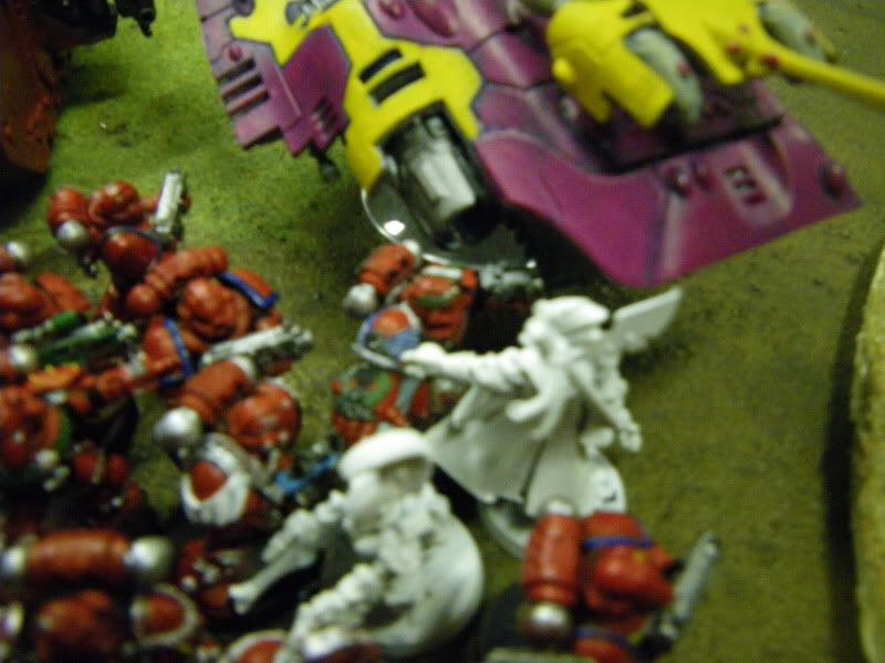 my opponent moves Pedro kantor and the remaining marines into combat with my Dire Avengers whilst the Land raider shoots at the Dark Reaper and the flanking Wave Serpent, but only manages to stop the Serpent from shooting.
