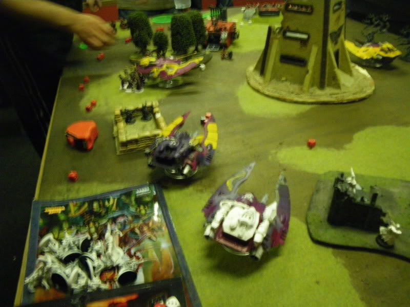 I run my now empty Wave Serpent away back behind the tower, so as not to throw away a 3rd kill point. Meanwhilst my still full Eldar Squad + remaining farseer get back into the Wave serpent and rev to safety, but not before my farseer casts guide on the Dark Reapers and Doom on the Sternguard.