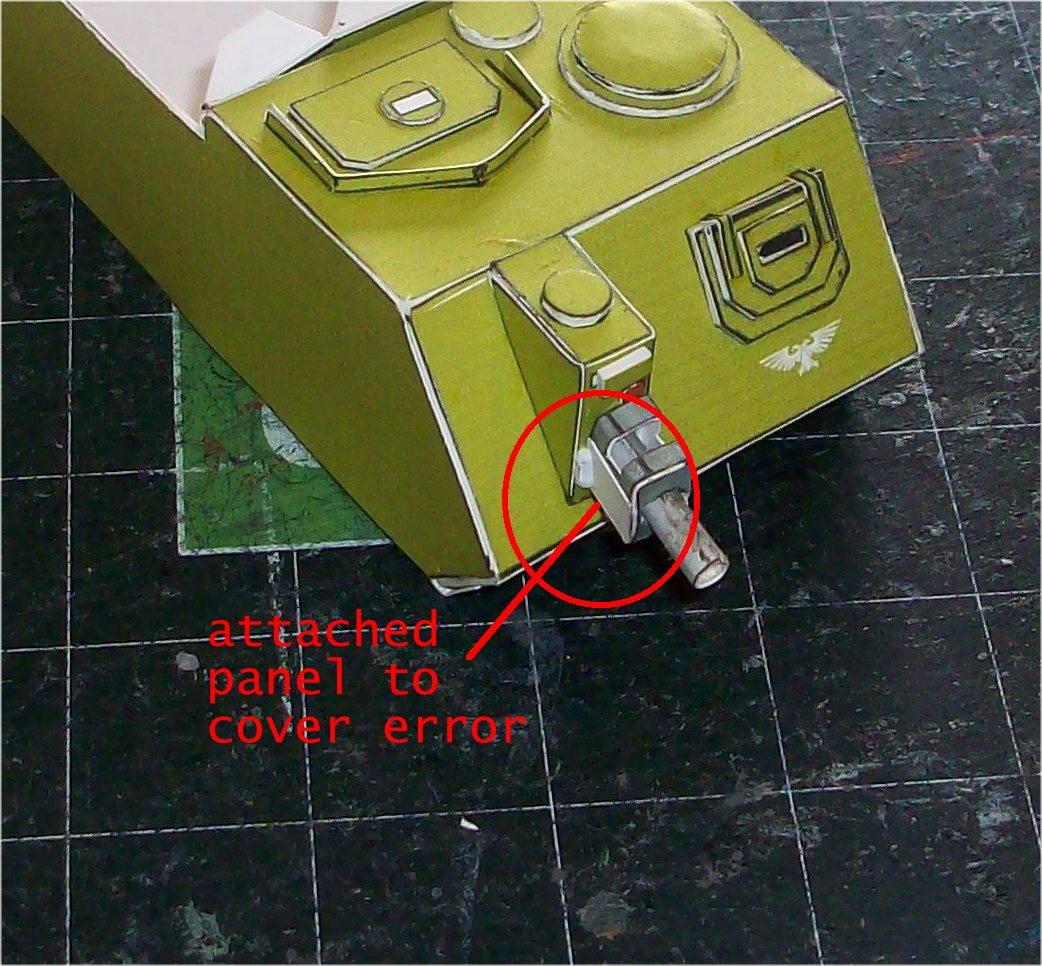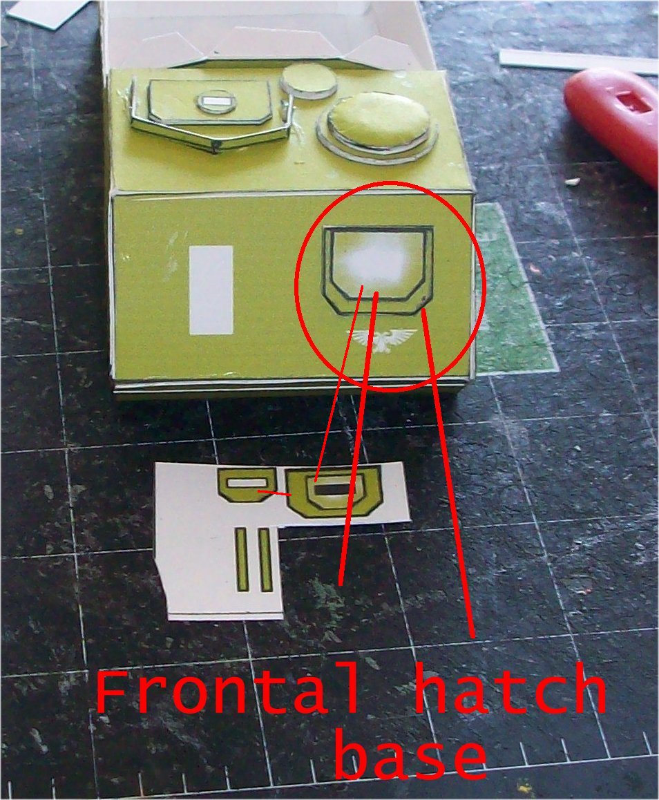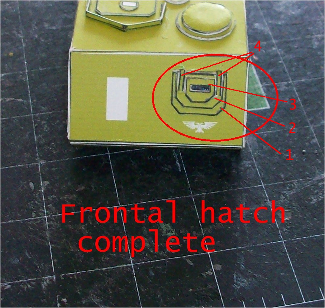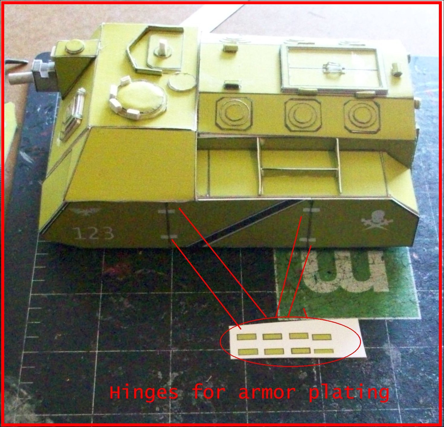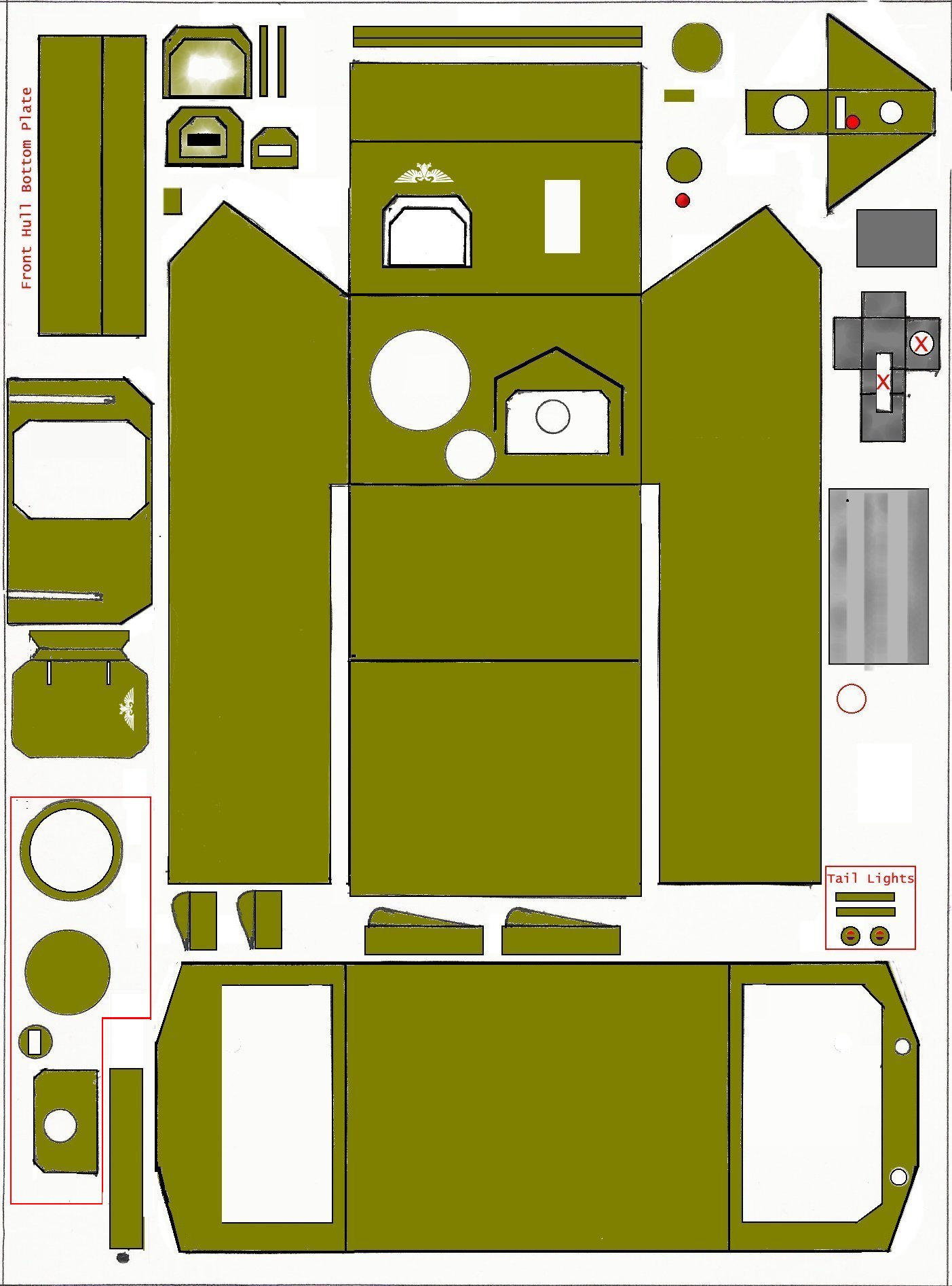 Here is the tutorial on making the hatches and front cannon. At the time of this build, the cannon casing was too short. There is an updated casing on the misc page of the plans. There are a lot of white edges on the model but do not worry about them now. later on in the build near the end, I will weather the Chimera and take care of all of the white edges. You can color them in as you go along or leave them alone until the end.