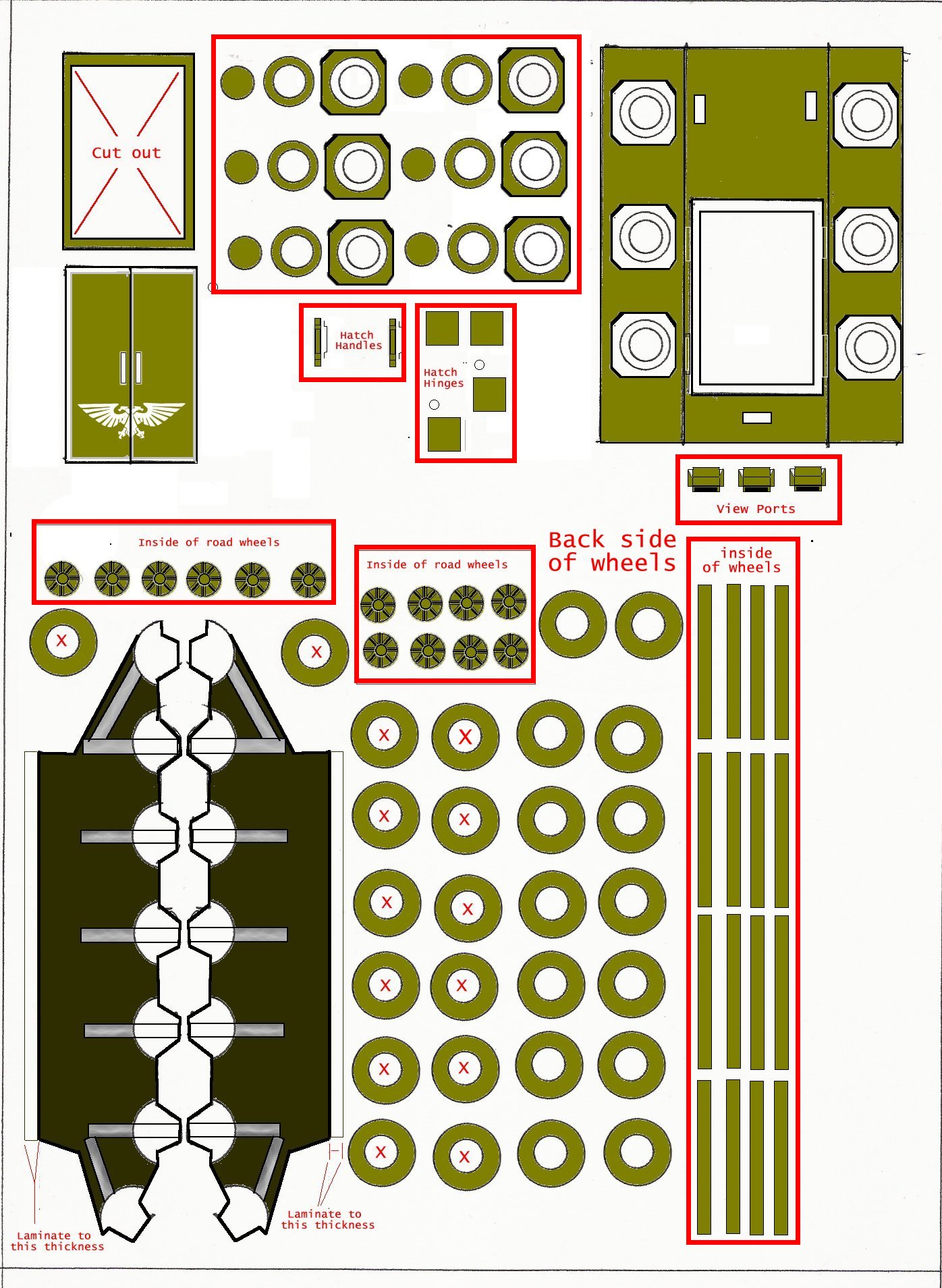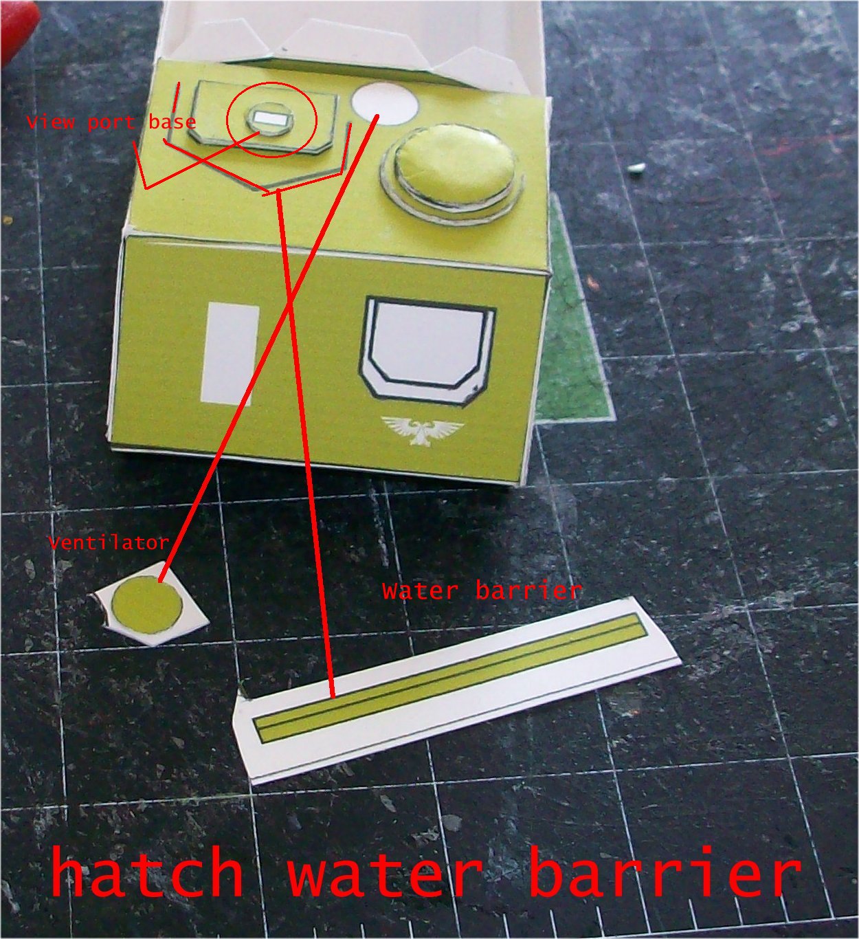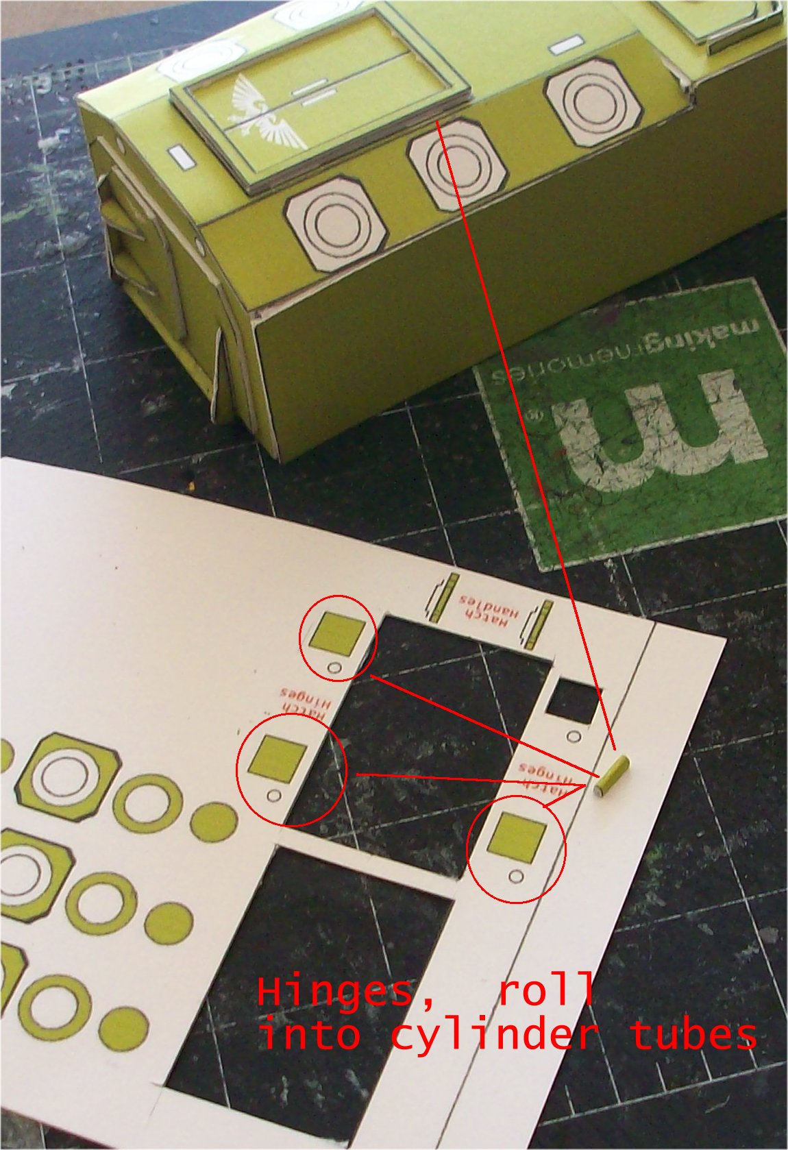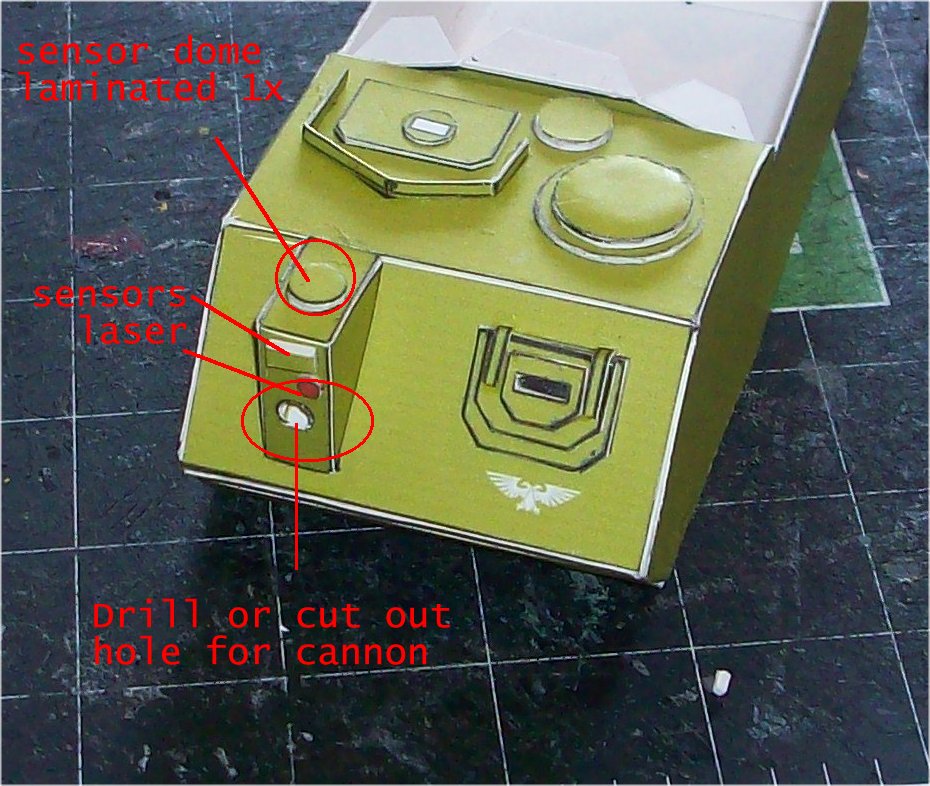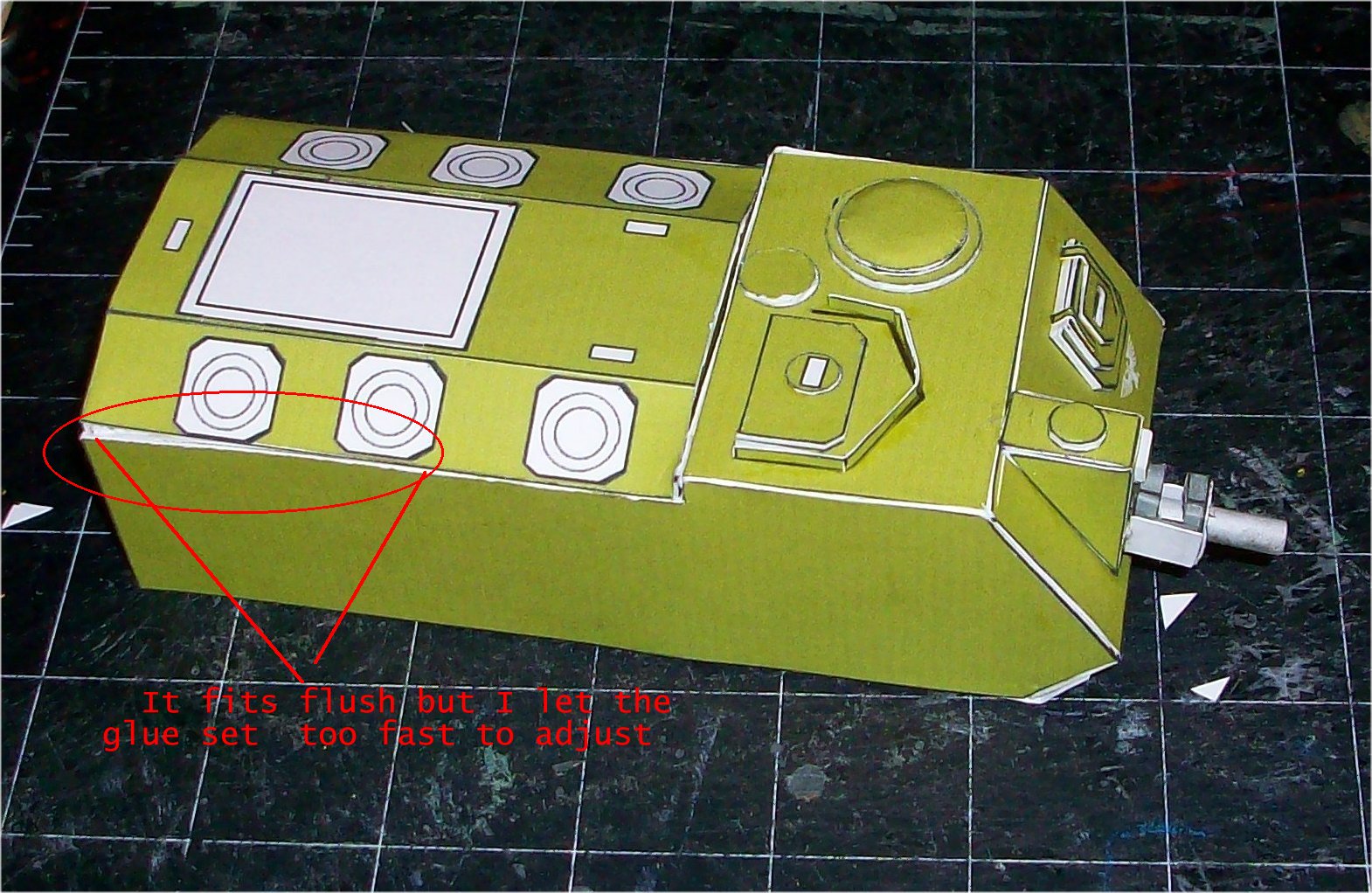 Here is the tutorial on making the hatches and front cannon. At the time of this build, the cannon casing was too short. There is an updated casing on the misc page of the plans. There are a lot of white edges on the model but do not worry about them now. later on in the build near the end, I will weather the Chimera and take care of all of the white edges. You can color them in as you go along or leave them alone until the end.
