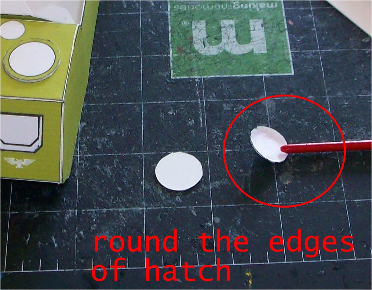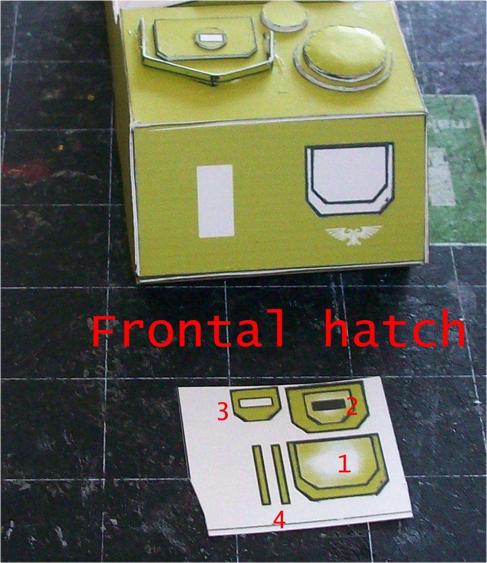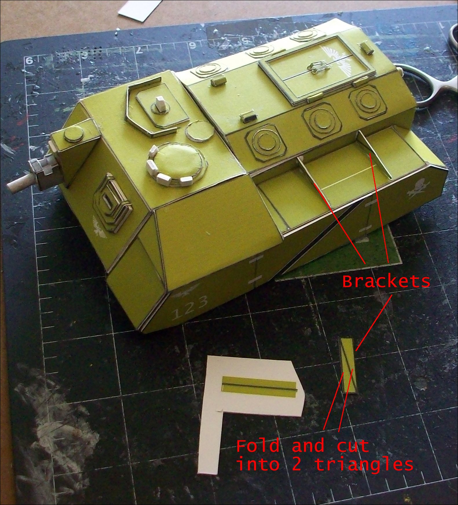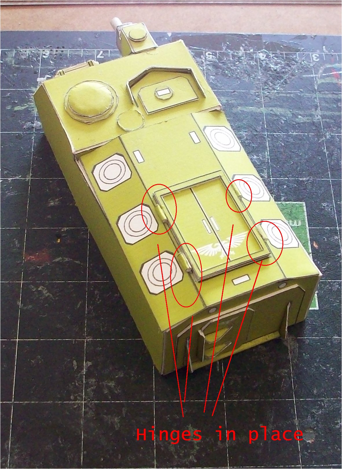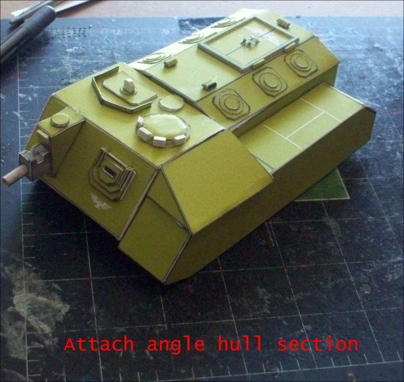 Here is the tutorial on making the hatches and front cannon. At the time of this build, the cannon casing was too short. There is an updated casing on the misc page of the plans. There are a lot of white edges on the model but do not worry about them now. later on in the build near the end, I will weather the Chimera and take care of all of the white edges. You can color them in as you go along or leave them alone until the end.